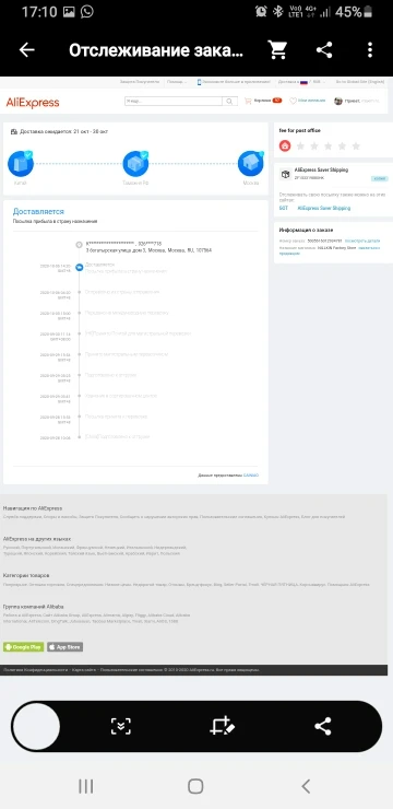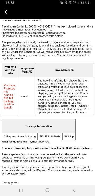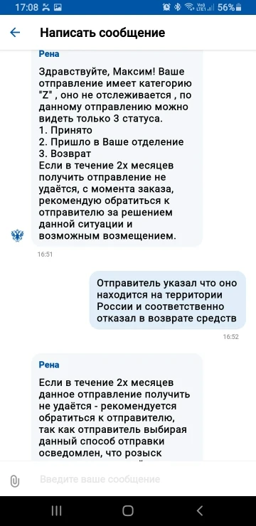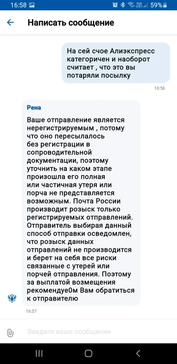 посылка не получена ,деньги не вернули,спор закрыли ,сказали что лежит в почтовом отделении,хотя по отслеживанию на скриншоте видно что до почтового отделения так и не дошло за три месяца. я разочарован. козел три месяца два заказа мозги еб..л и кинули.