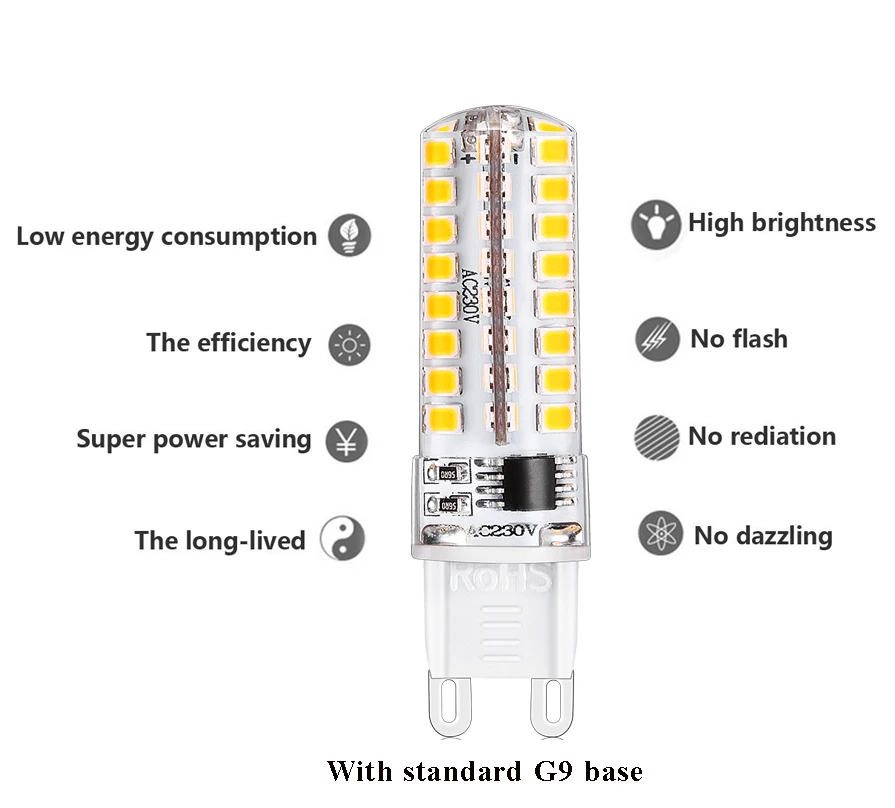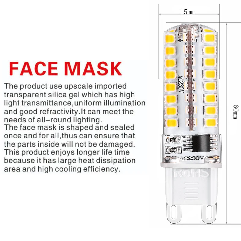 Маска для лица: в этой светодиодной лампе G9 используется высококлассный импортный прозрачный силикагель, который обладает высоким коэффициентом пропускания светильник, равномерным освещением и хорошей рефракцией. Этот светодиодный G9 может удовлетворить потребности во всестороннем освещении. Маска для лица формируется и закрывается раз и навсегда, тем самым гарантируя, что части внутри не будут повреждены. Эта светодиодная лампа G9 220 В 110 В имеет более длительный срок службы, так как имеет большую площадь рассеивания тепла и высокую эффективность охлаждения.