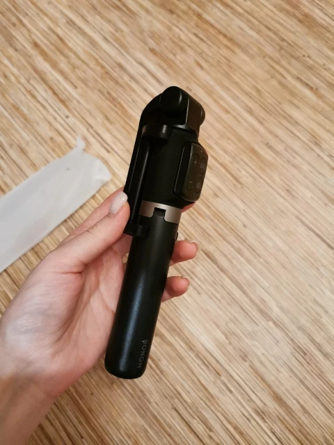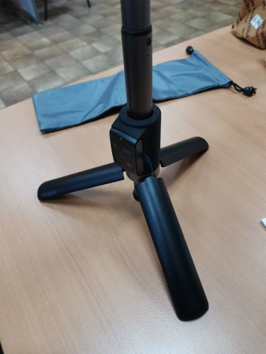Трипод очень понравился, удобный и стильный. Сделан аккуратно, из качественных материалов, нет ни сколов, ни царапин. В руке не скользит, плюс на все части, касающиеся смартфона и кнопки (и на ножки) нанесено мягкое покрытие. На ровных поверхностях стоит уверенно, механизм ножек на магнитах. Поворот на 360⁰ возможен, если закрепить смарт в держателе близко к нижней части. На фото размеры фиксирующей части, в глубине она на сантиметр шире. Как все селфи-палки, немного "гуляет" на ветру, зато держать легко, нетяжёлая. Очень функциональная кнопка - снимок, приближение, удаление, смена на фронталку, запись видео (работает и без самой палки, разумеется). Не меняет удалённость в режиме селфи, а жаль. С Honor и Xiaomi сконнектилась легко, работает на "таблетке" CR 2025 (нужно выдернуть защитную плёнку). Доплачивала за упаковку, всё приехало целое за месяц, трек отслеживался. Продавцу большое спасибо, трипод советую, качественный, есть с чем сравнить - свою цену однозначно оправдывает.