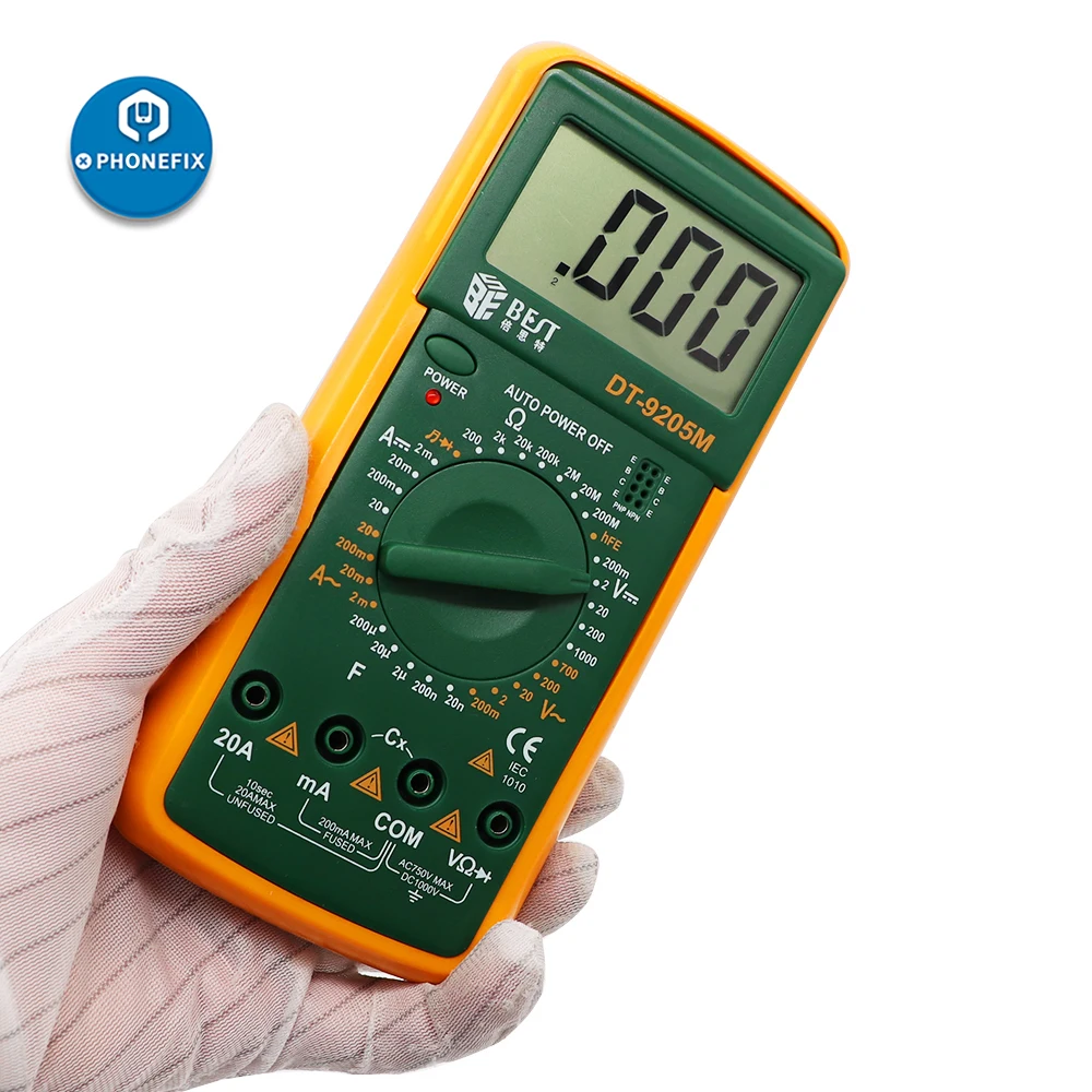 Цифровой мультиметр BEST DT9205M-это простой в эксплуатации, точные показания, полнофункциональный, компактный, удобный в переноске, портативный мультиметр с большим ЖК-экраном на батарейках для ремонта материнской платы телефона, DT9205M цифровой мультиметр для трех с половиной, таблица может быть использована для измерения напряжения постоянного тока/электрического, напряжения переменного тока/тока, Испытание сопротивления, емкости, тест диодов, измерение транзистора HFE, выключение цепи и т. д.