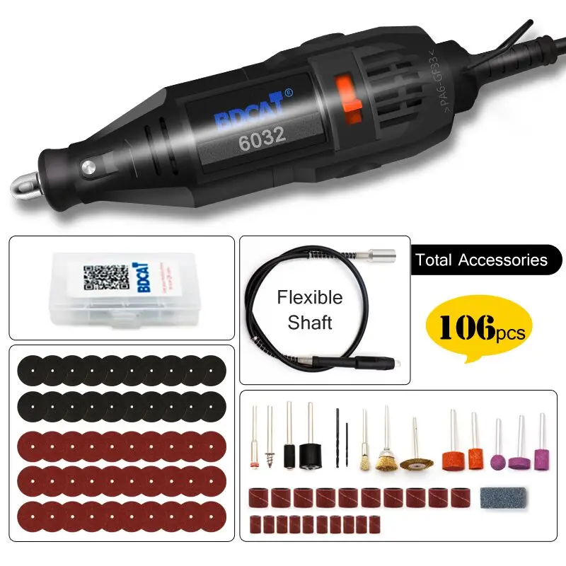 Электрический гравер BDCAT 180 Вт, вращающийся инструмент Dremel, мини-дрель с переменной скоростью, шлифовальный станок с 106 шт. аксессуаров для электроинструментов