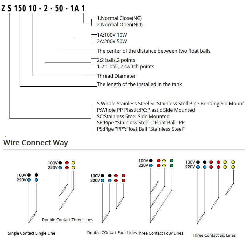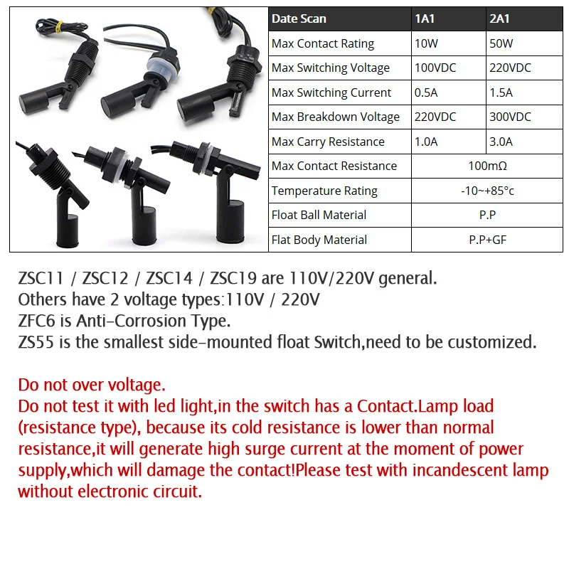 ZSC11 / ZSC12 / ZSC14 / ZSC19-общие напряжения 110 В/220 В.Другие имеют 2 типа напряжения: 110 В/220 ВZFC6-антикоррозийный тип.ZS55-самый маленький боковой Поплавковый выключатель, который необходимо настроить.