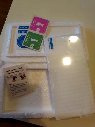 В комплекте два стекла, две пары салфеток и два пакетика с гелем и кисточками. Упаковка - супер! Сами стёкла на пару миллиметров уже экрана, что только облегчает наклеивание. Отверстия при этом совпадают точь-в-точь.