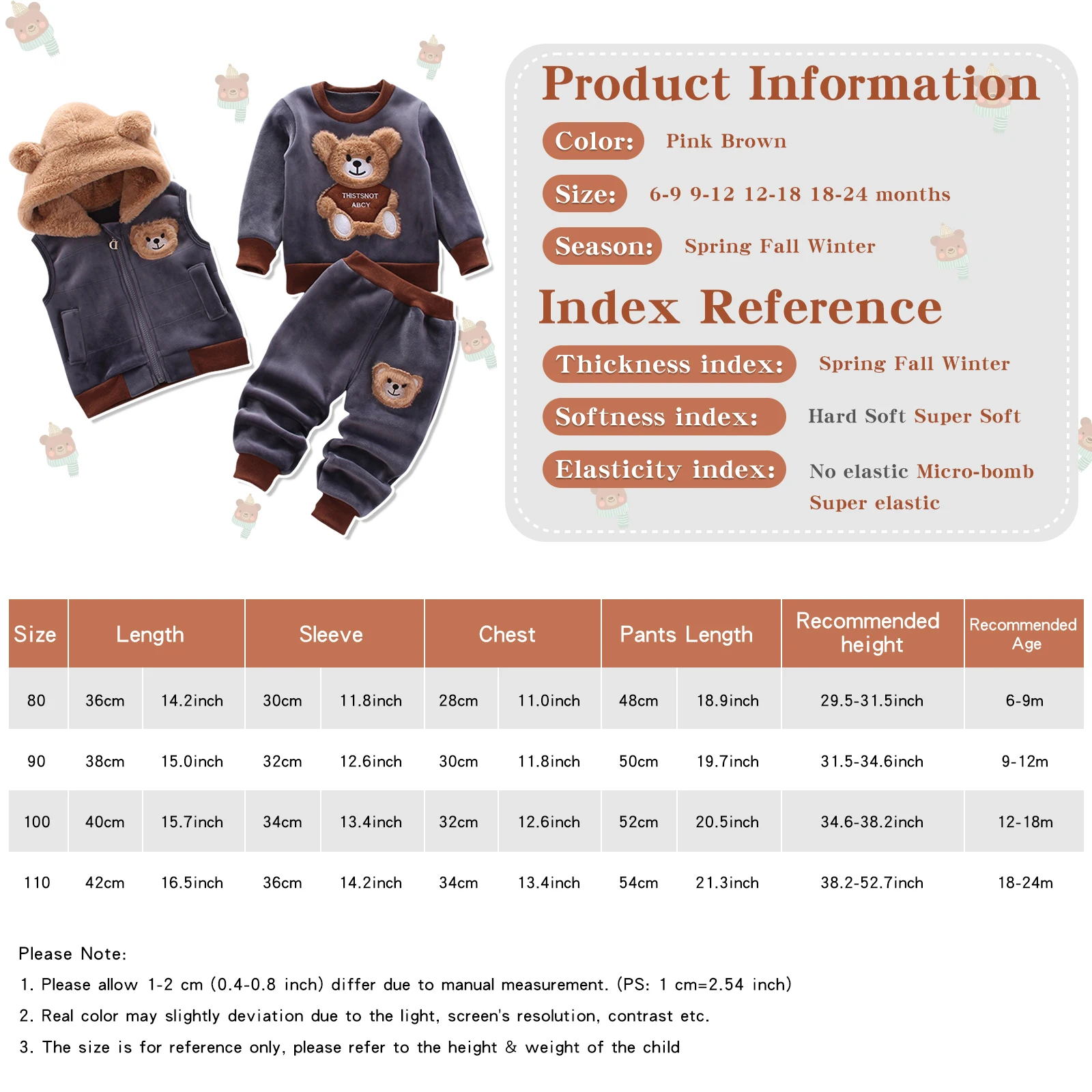 в целом костюм хороший, у штанишек цвет чуть отличается от заявленного, но это не страшно, размер точный, быстрая доставка