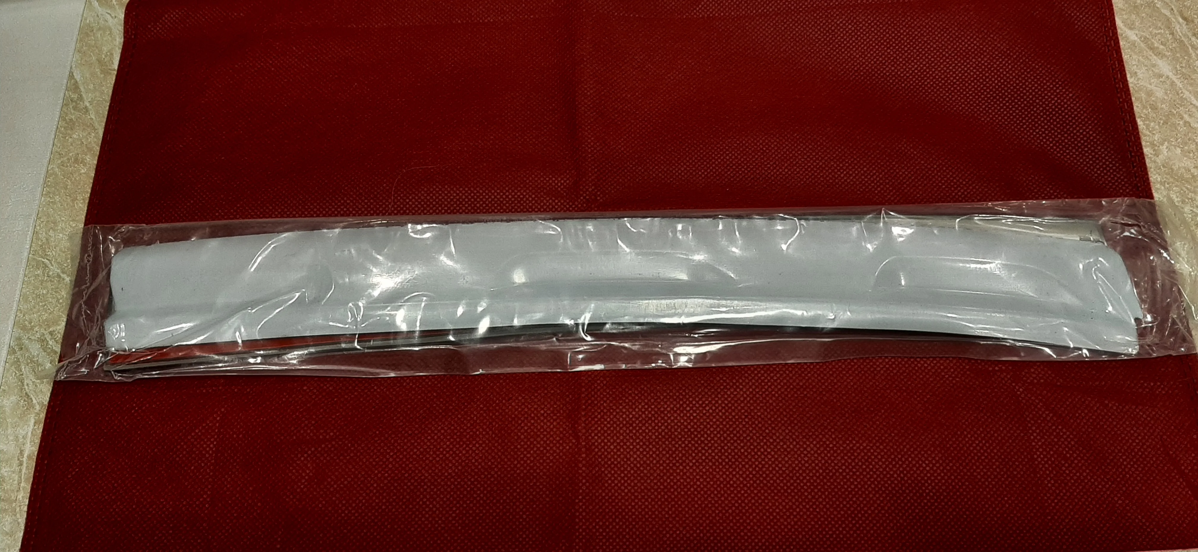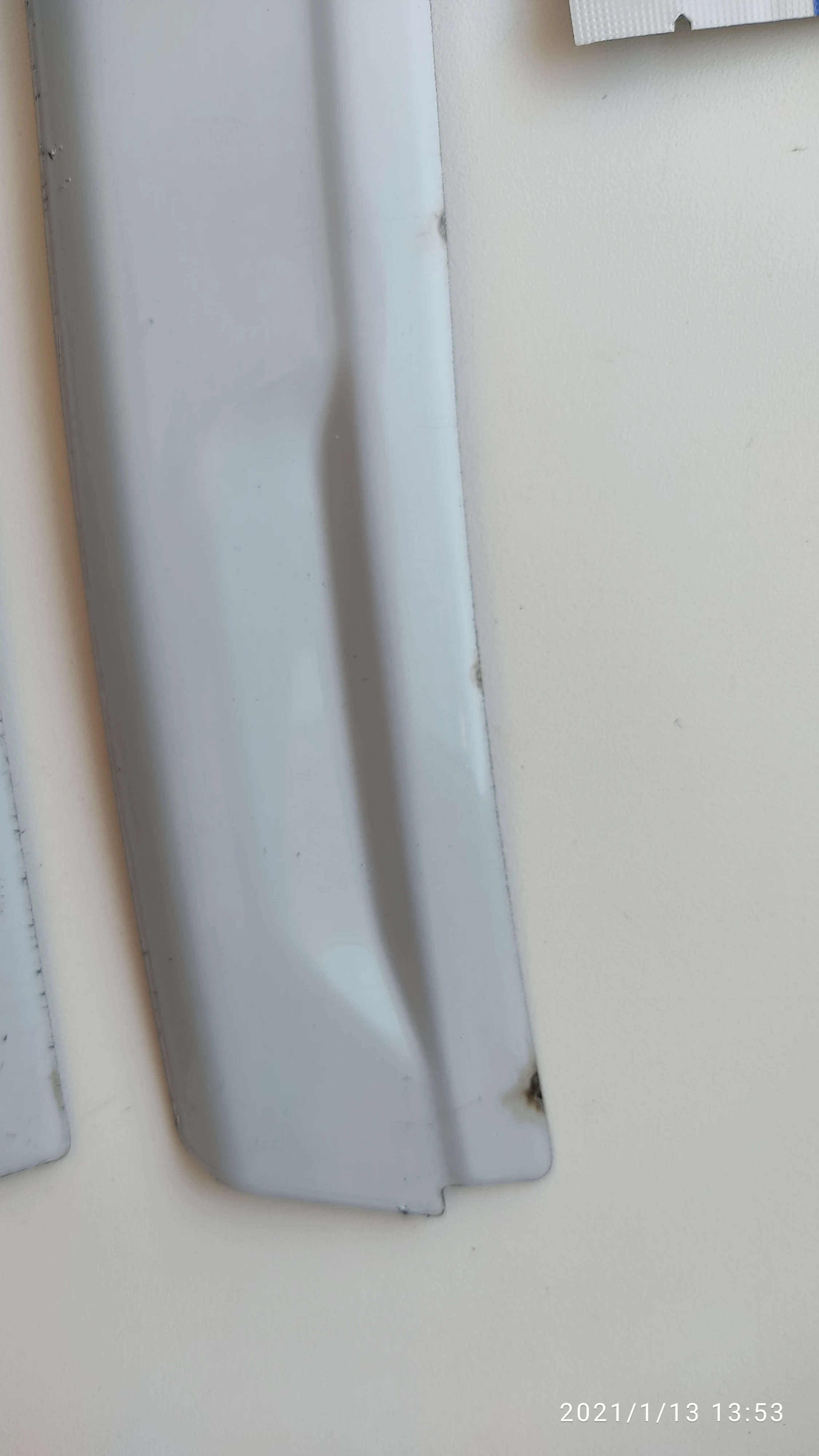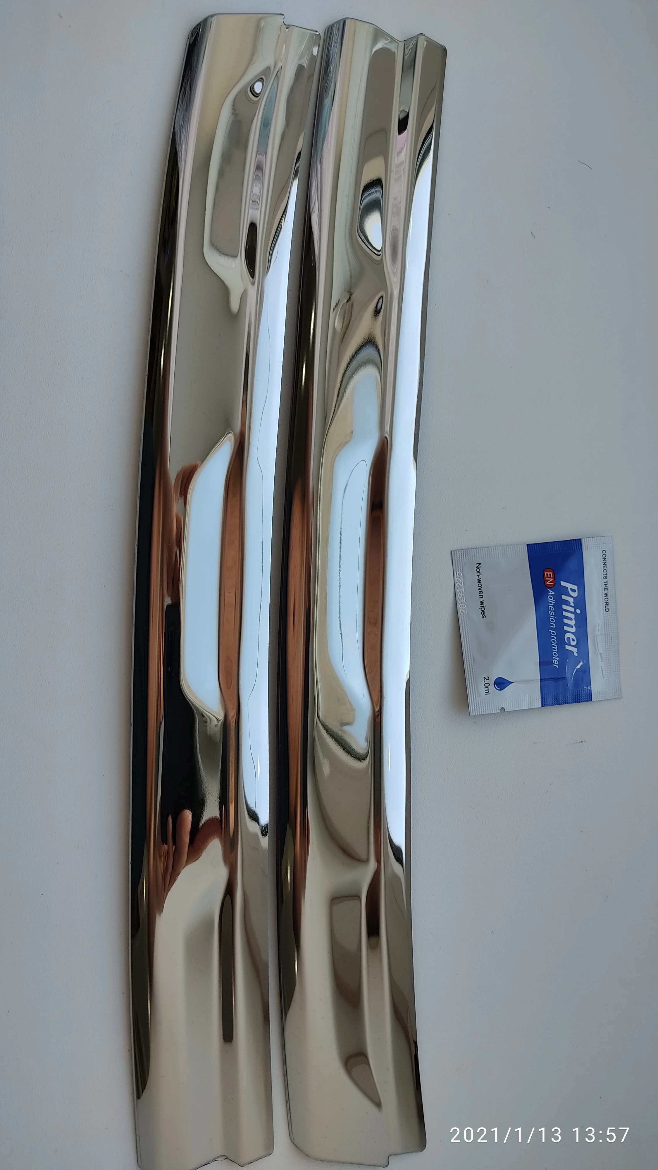 Посылка пришла менее чем за месяц. Накладки были завёрнуты в пупырку, в довольно большом рулоне. После распаковки первое, что бросилось в глаза это как-бы ржавые пятна на одной из накладок (см фото). После того как снял защитную плёнку на этой накладке были обнаружены пятна. Думаю, что накладки долго не проживут - пойдут ржавыми пятнами. Естественно, что в отзывах этого нет, так как дополнять отзыв к тому времени когда пойдут пятна ржавчины уже не получается - время вышло. Сам буду устанавливать накладки летом, когда будет тепло. Поэтому как они будут смотреться со штатным хромом не знаю. Качеством железяк разочарован, ожидал большего. Скотч не 3М, обычный красный. Надеюсь будет держать.