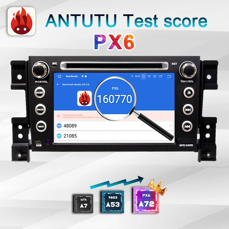 PX6PX6 является лучшим чипом на рынке в настоящее время, он работает быстрее, чем все другие типы. Балл ANTUTU составляет 160770, что лучше 9853 4G + 64G, PX5 и всех других типов 4 + 64G на рынке. По сравнению с другими радио типа fo, PX6 radio может загружать больше видов приложений android с android market, и приложение может работать лучше.