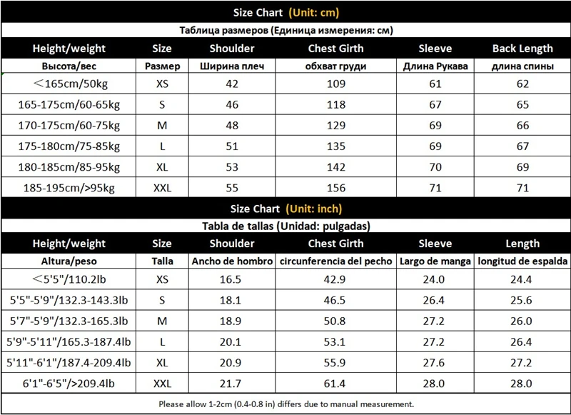 Пожалуйста, выберите свой размер в соответствии с вашим ростом и весом и подтвердите это снова, сославшись на вышеуказанные измерения.Пожалуйста, убедитесь в том, что куртка грудь, по крайней мере, 25-30 см (9,8-11,8) больше, чем ваш груди.