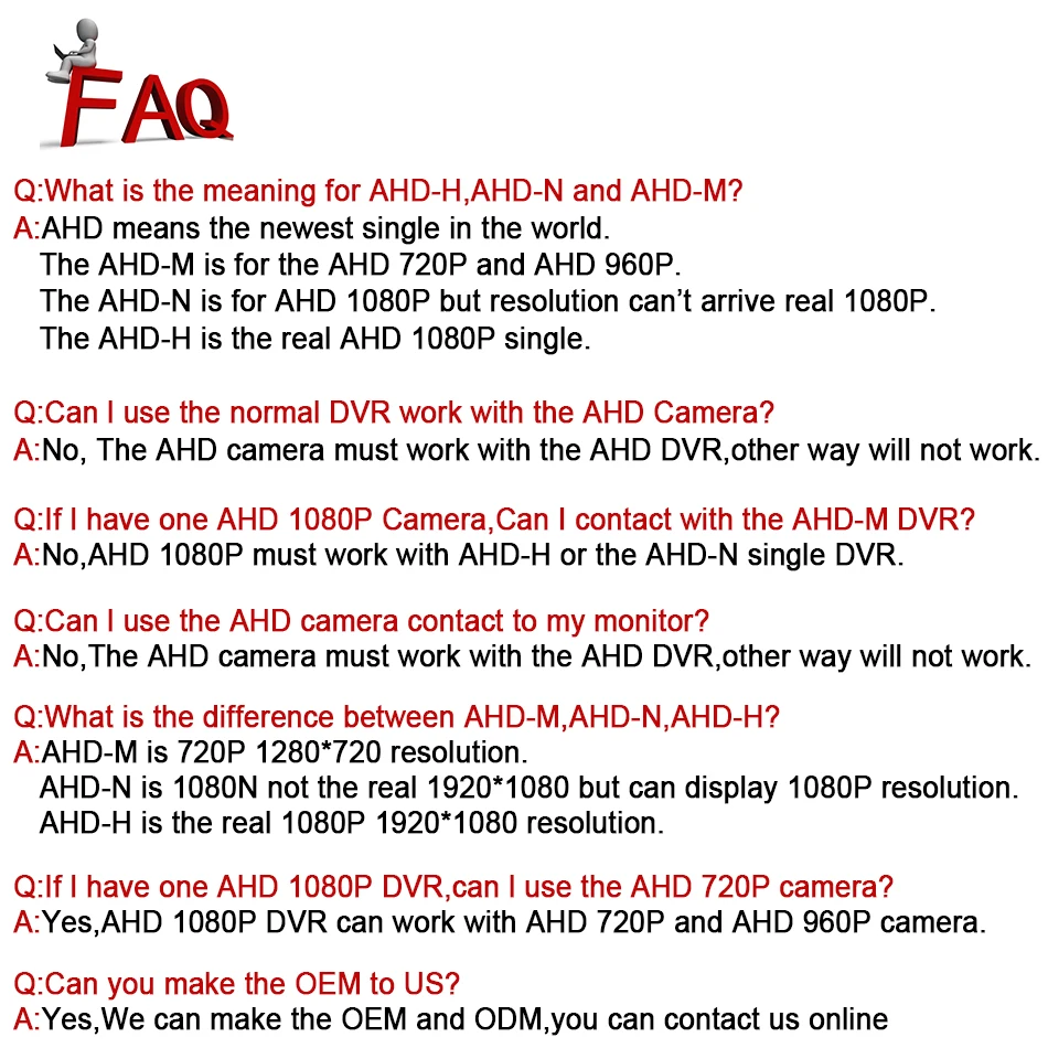 7. AHD (аналог высокой четкости), новый формат видео для улучшенной CVBS (КОМЕТА *) и HD передачи видео.8. HD AHD камера является стандартом передачи аналогового HD видео с помощью коаксиального кабеля, что позволяет передавать HD на большие расстояния по более низкой цене, чтобы удовлетворить требования к сложной и большой установке.9. Обычно используется коаксиальный кабель, SYV-75-5 кабель может передавать видео более 500 метров. 10. Должен работать с 5MP AHD DVR