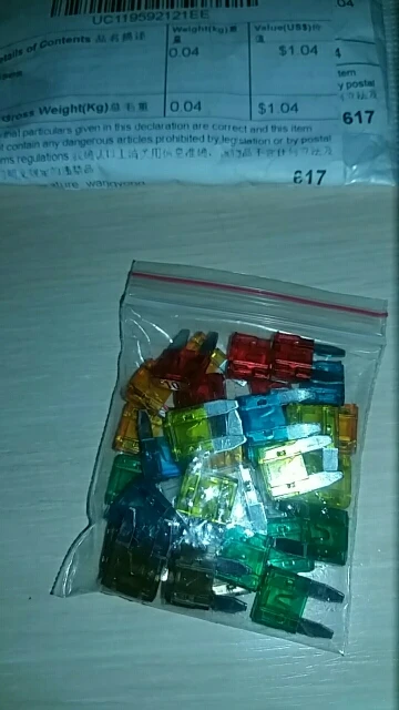 Доставка 19 дней.Быстро,только потому что сложили 7 заказов в одну посылку.Иначе бы ехало дней 50. С виду предохранители,как предохранители.Не проверял,если честно,бросил сразу в машину. В комплекте 35 штук(от 5 А до 30 А),жаль нет трехамперных. На фото подписал какие цвета идут по номиналам.Хотя на каждом есть обозначение,не ошибетесь. За сим откланиваюсь,более добавить нечего.