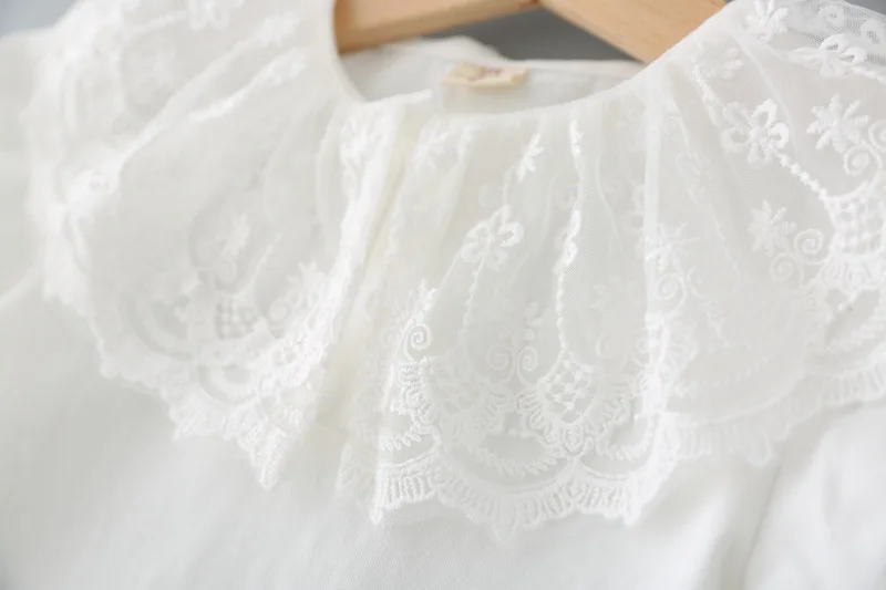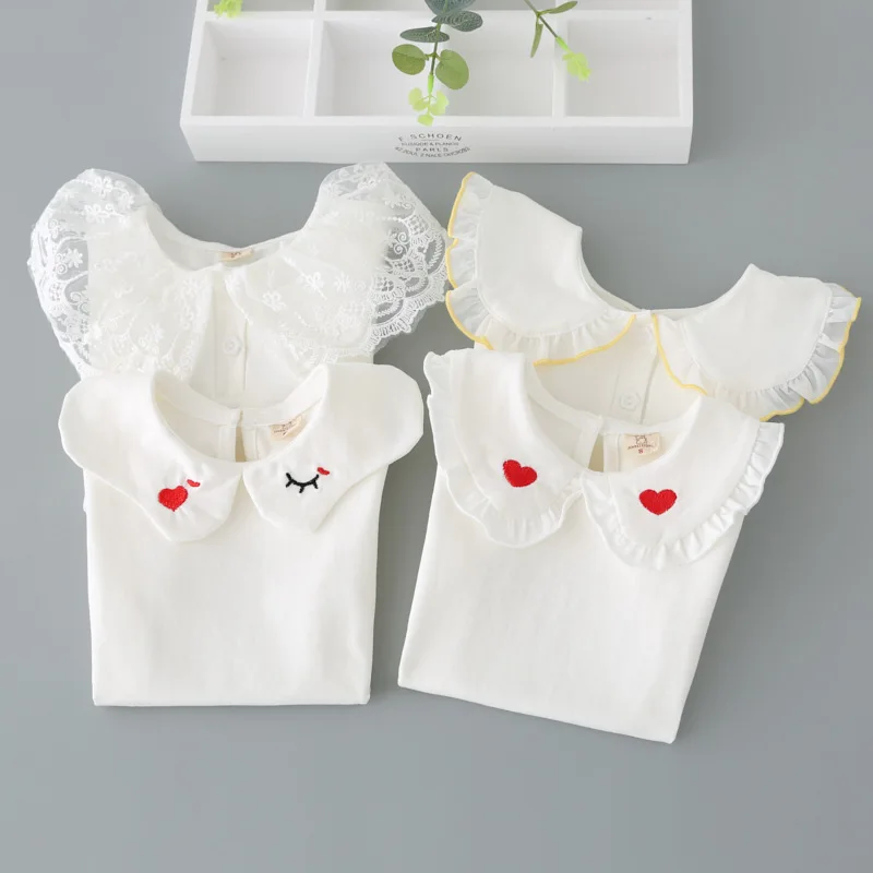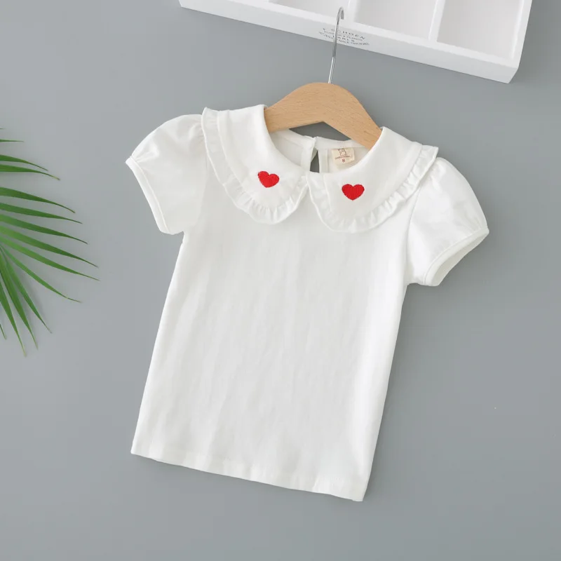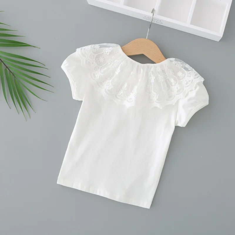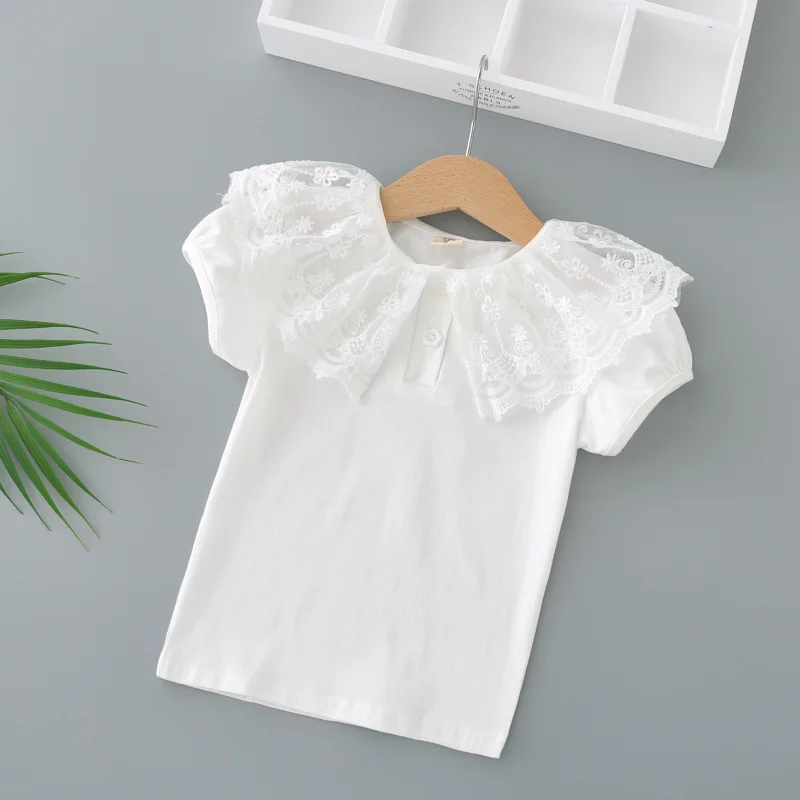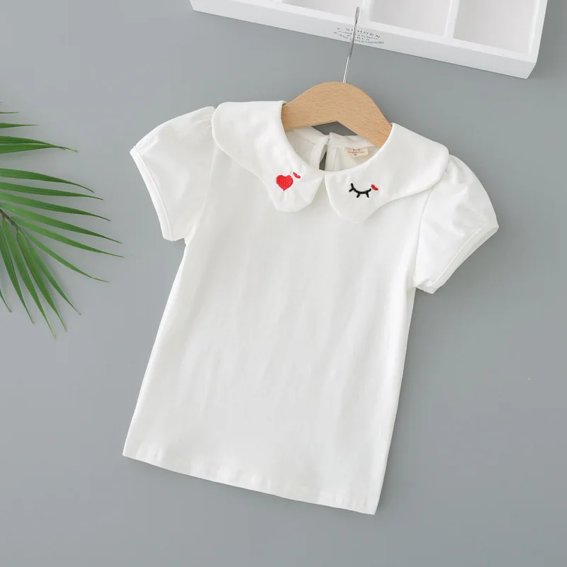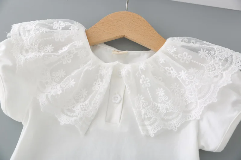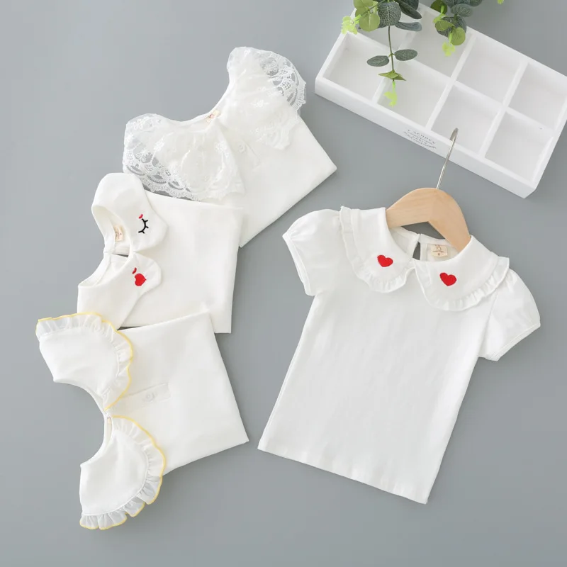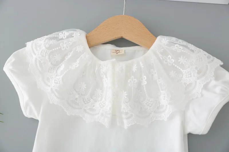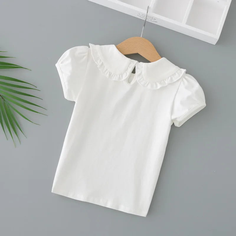 Модные топы для маленьких девочек, хлопковая блузка с коротким рукавом для младенцев, топы с отложным воротником, рубашки, белые 66-170 см, DT379