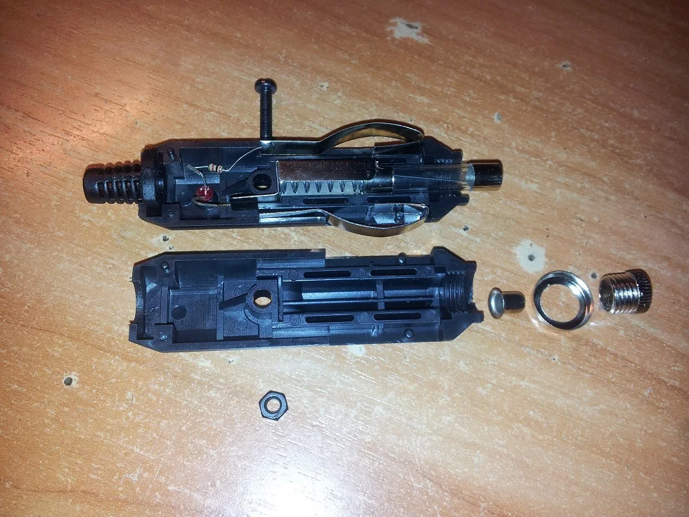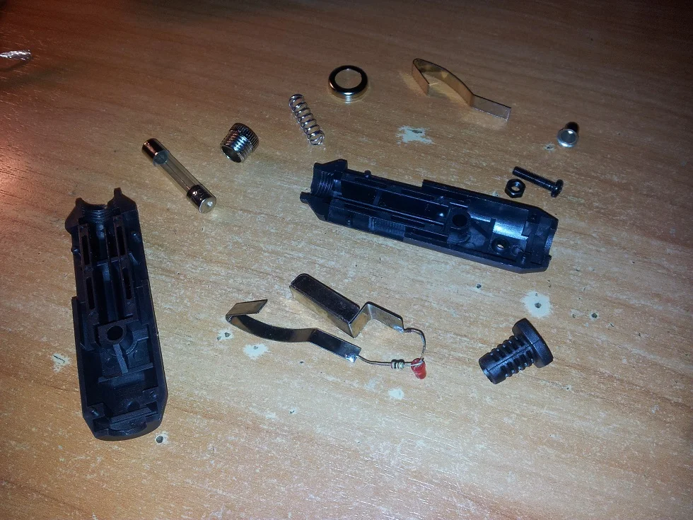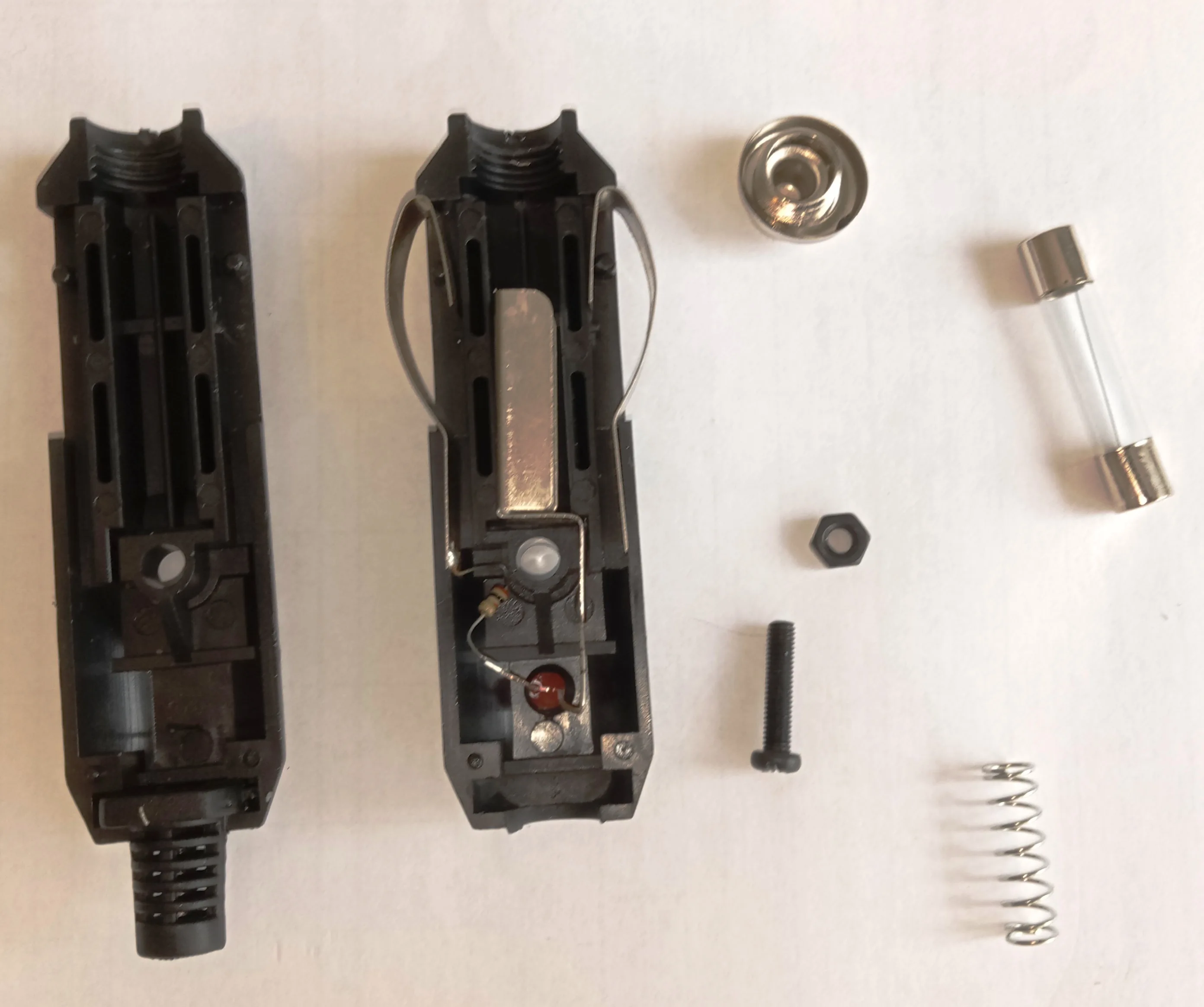 есть предохранитель и светодиодный индикатор. надо припаять пружину что бы не потерять.