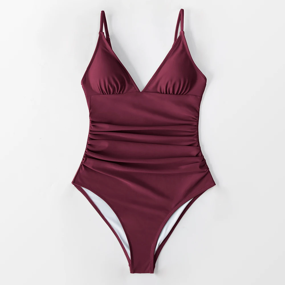 CUPSHE сплошной темно-красный волнистый край декольте цельный купал...