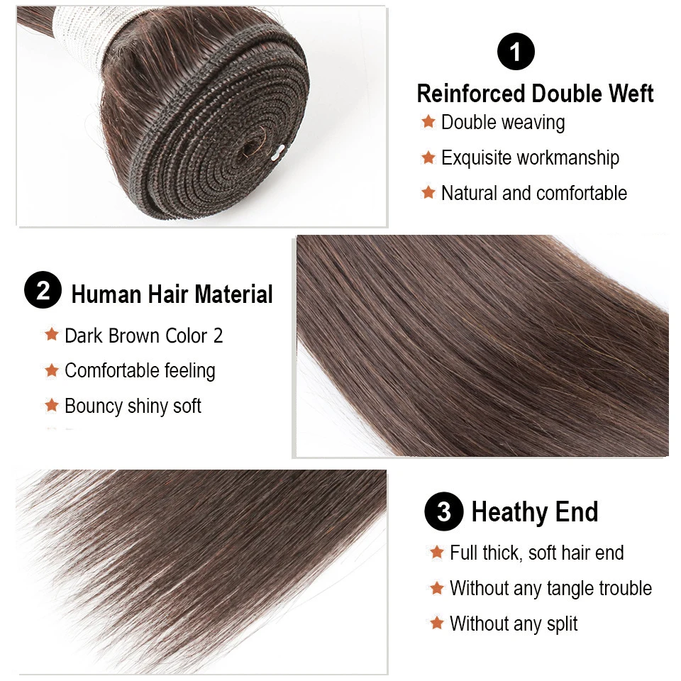 Цвет 2 темно-коричневые прямые пучки волос с Clousre, 10-24 дюйма