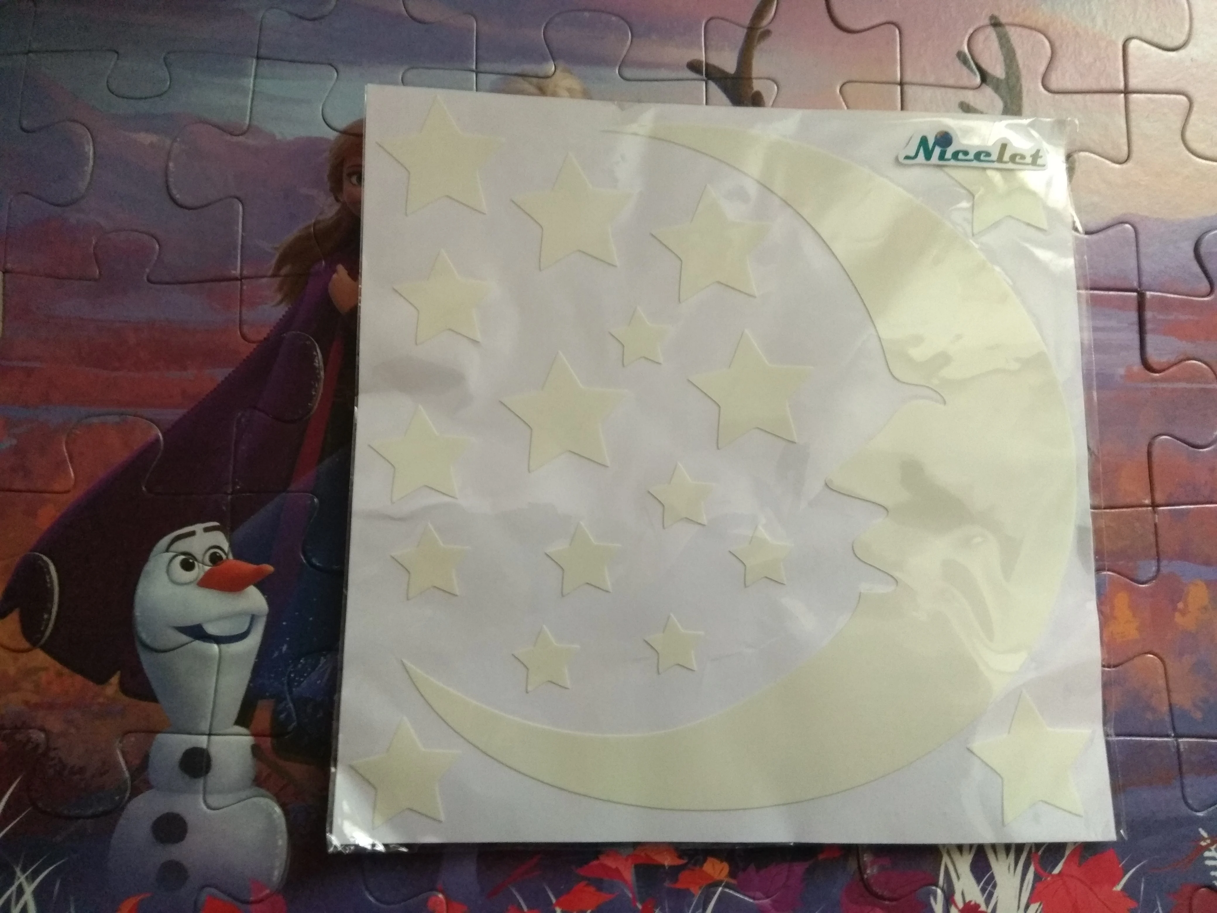 Заказал для пробы, в детскую. Светит не очень ярко,не заряжать специально. Наклейка виниловая, клеится хорошо. Приехала быстро, так как несколько посылок объединили в одну. Считаю это очень удобной опцией на али. Забирал на кассе в Пятёрочке.