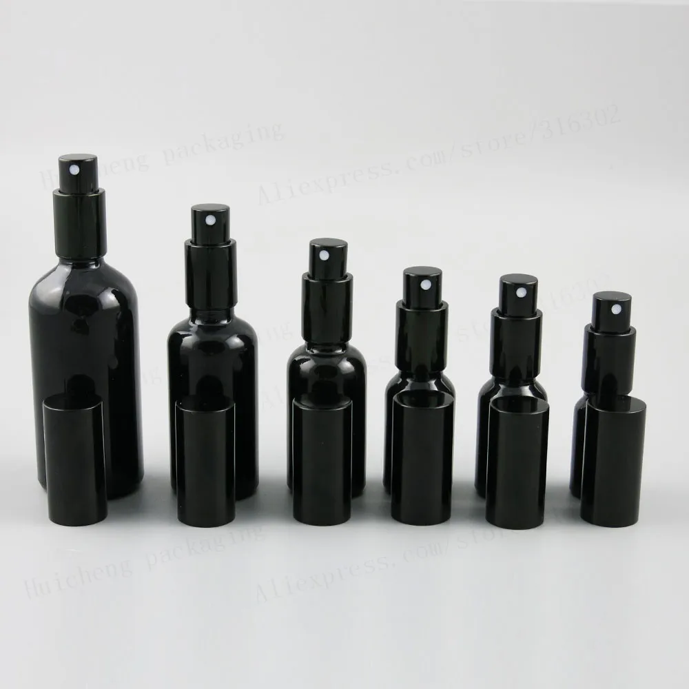 Черная Стеклянная бутылка с алюминиевым распылителем, дорожный стеклянный атомайзер для духов, 100 мл, 50 мл, 30 мл, 20 мл, 15 мл, 10 мл, 200 шт.