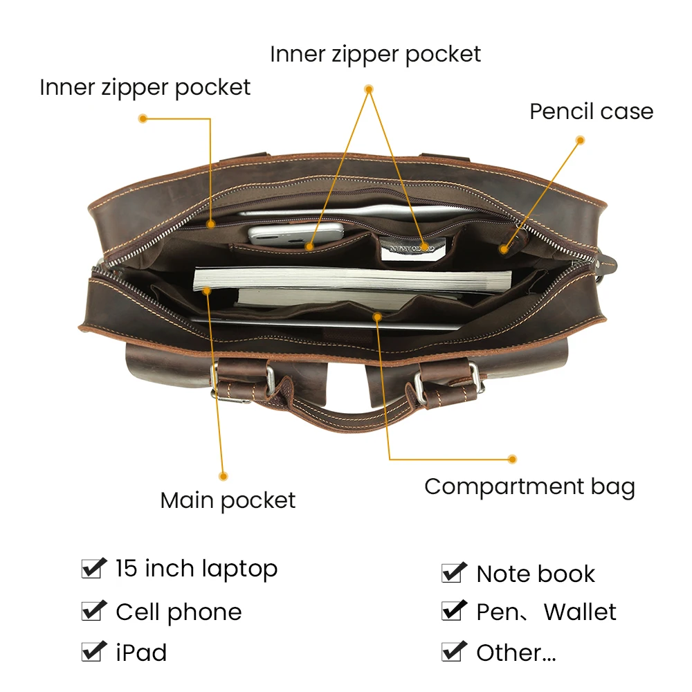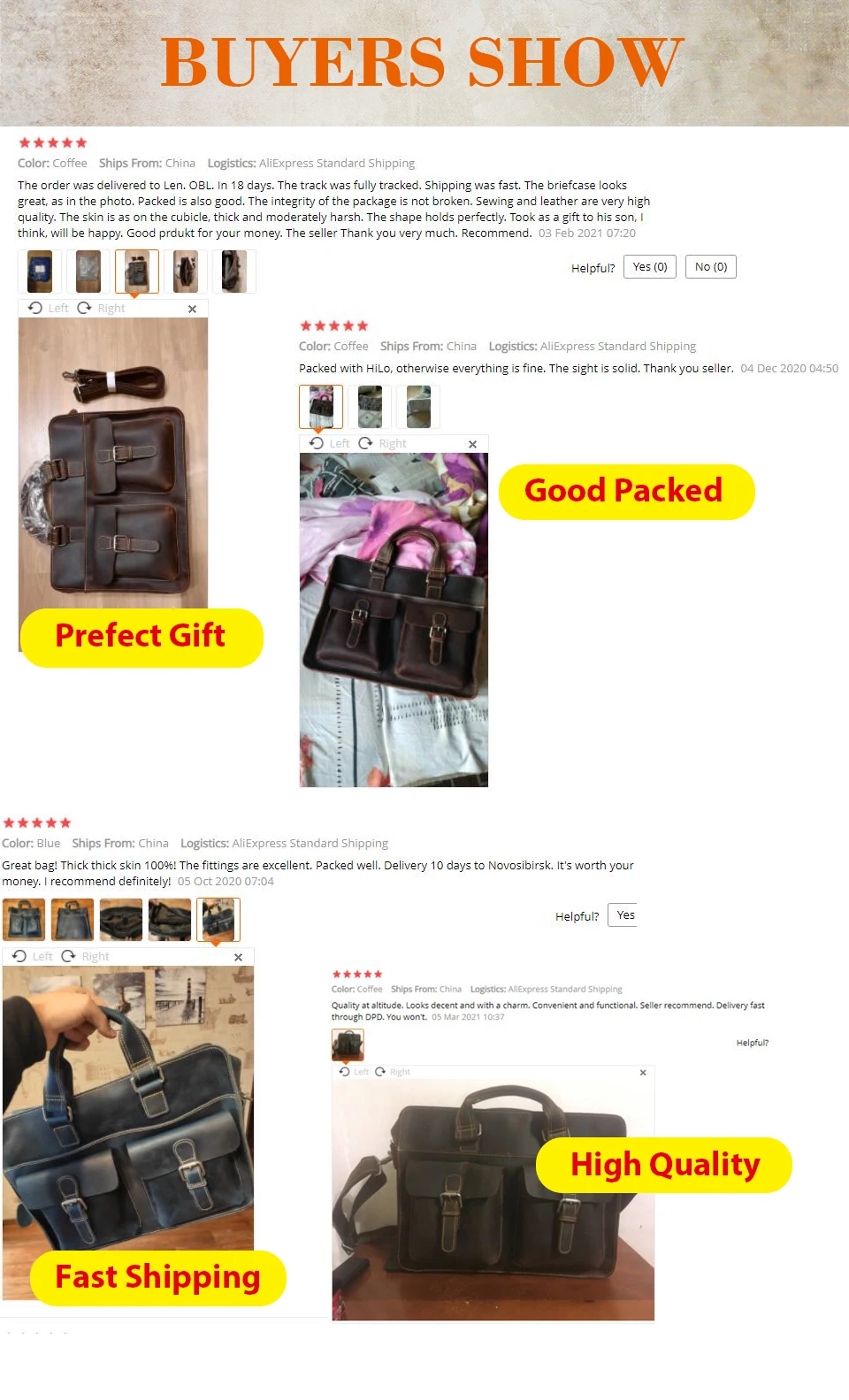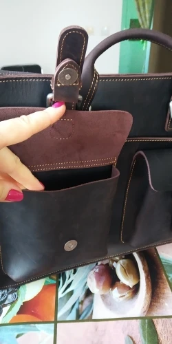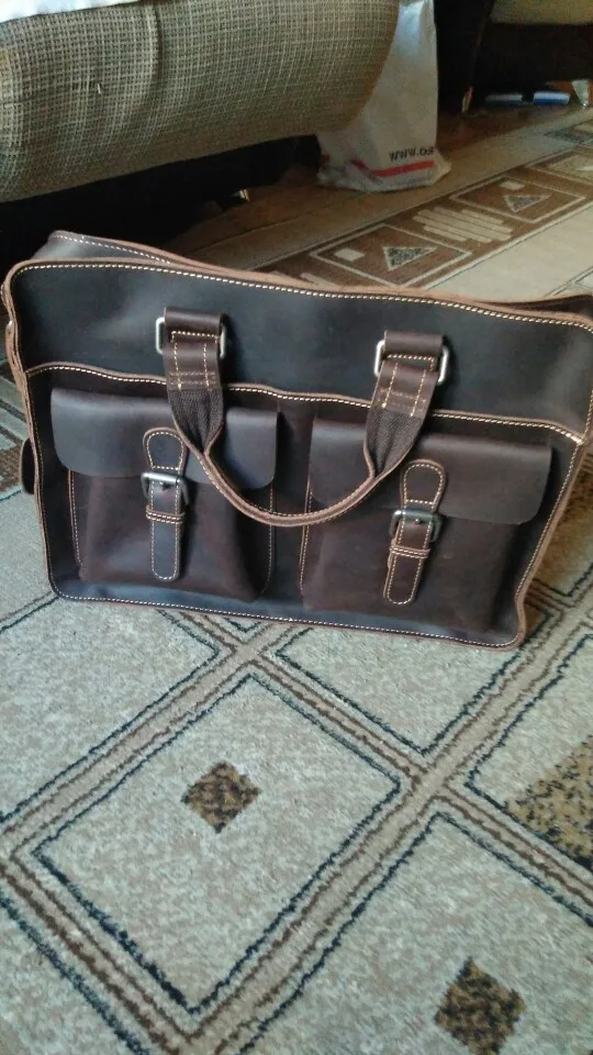 Действительно шикарная сумка. 100% натуральная толстая кожа, прошла все проверки. Выглядит и ощущается в руке очень брутально и солидно. Ощущение очень надежной вещи. Заказывал в черном исполнении. Пришла из Китая до Спб за 10 дней в пункт выдачи DPD у моего дома, за что большой респект продавцу. Отправил сразу же после заказа. Немного кое-где по периметру сумки торчат ниточки, но решается всё зажигалкой) Внутри сумки всё идеально прошито, прострочено. Ткань внутренней отделки достаточно плотная. В целом, сумка очень вместительная, но при этом сама по себе тяжеловатая, около 2 кг. веса, но это и понятно из-за толщины кожи.. В неё легко помещается ноутбук 15,6 вместе с док-станцией к нему и прочими вещами. Магниты на передних карманах сильные, держат хорошо. У ручек оптимальная длина и толщина, то что надо. В общем друзья, крайне рекомендую и продавца и данную сумку. Она будет идеальным решением как для себя любимого, так и в подарок мужчине. У нас такие в Спб стоят от 10 тыс.руб.