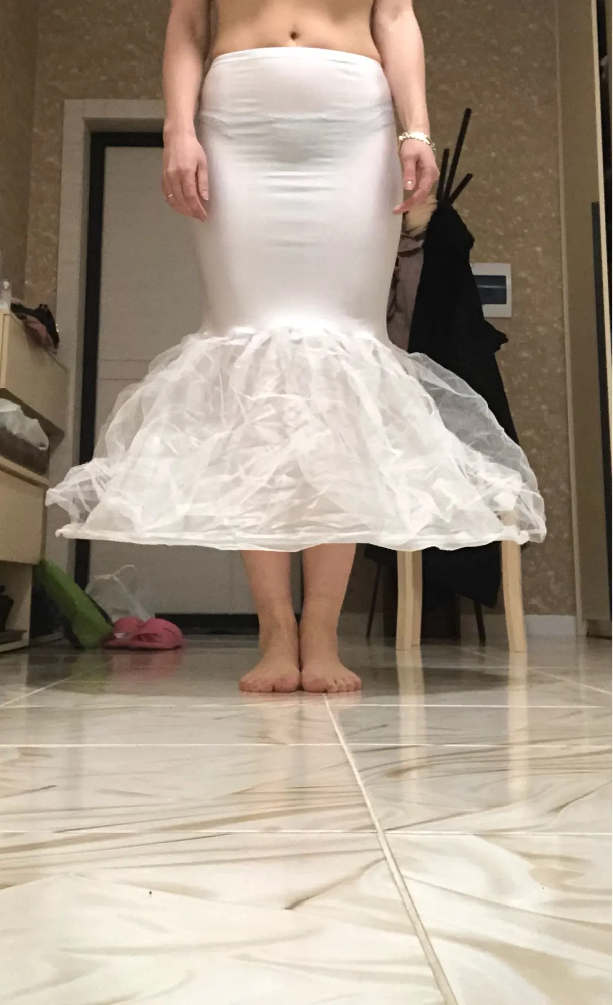 Расстроена. Подъюбник на рост наверно 150...мне для моего роста (172) реально см 20 не хватает. Тут в пол на картинке, а на мне чуть ниже колена. Выкинула сразу, жениху даже показывать не стала. Строчки нервные, даже видна была асимметрия на один бок. В общем думайте сами. Рекомендовать не буду, мне покупка не понравилась. Но если все же надумаете купить обязательно!!! сообщите продавцу свой рост, а то как я получите фигню.