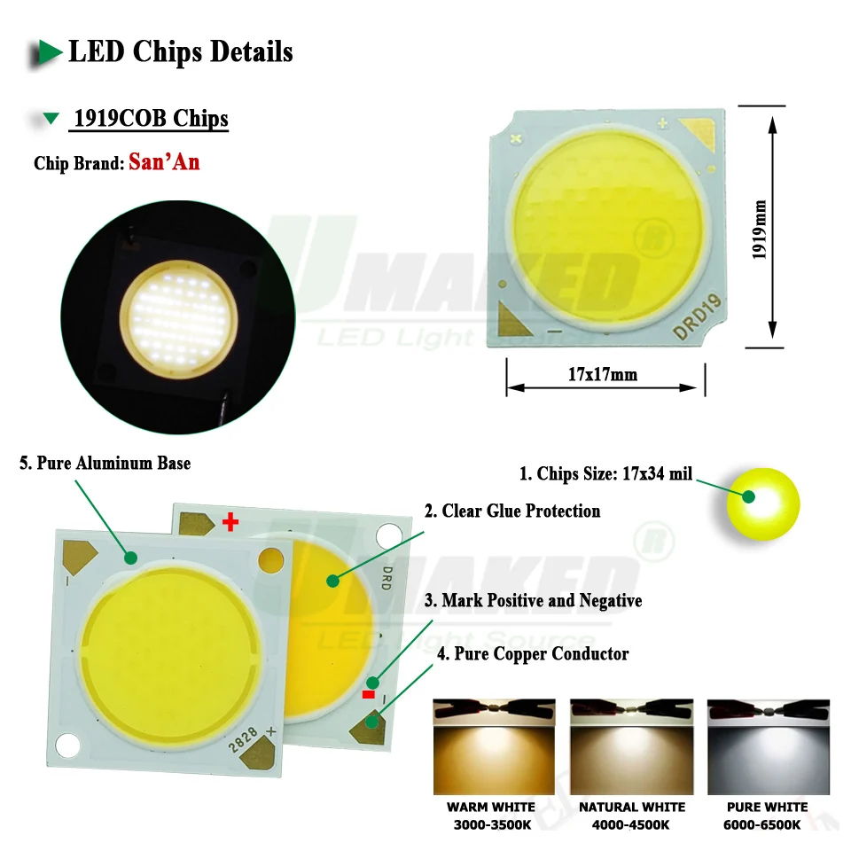 Чип COB 10, 12, 15, 18, 20, 24, 30, 40, 50 Вт, 1313, 1919, 2828, светодиодный светильник для потолочной лампы, точечный светильник, 17 х3, 4 мил, 5 шт.