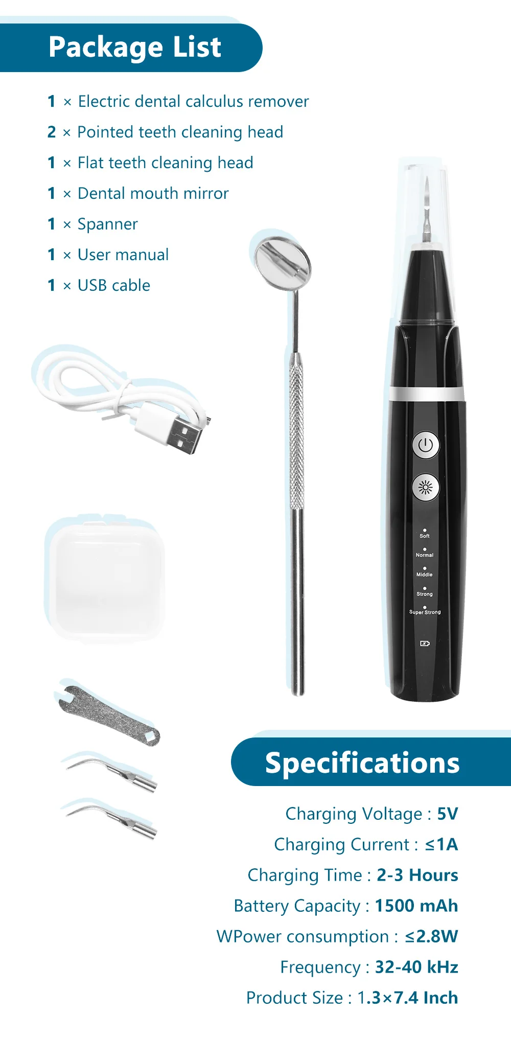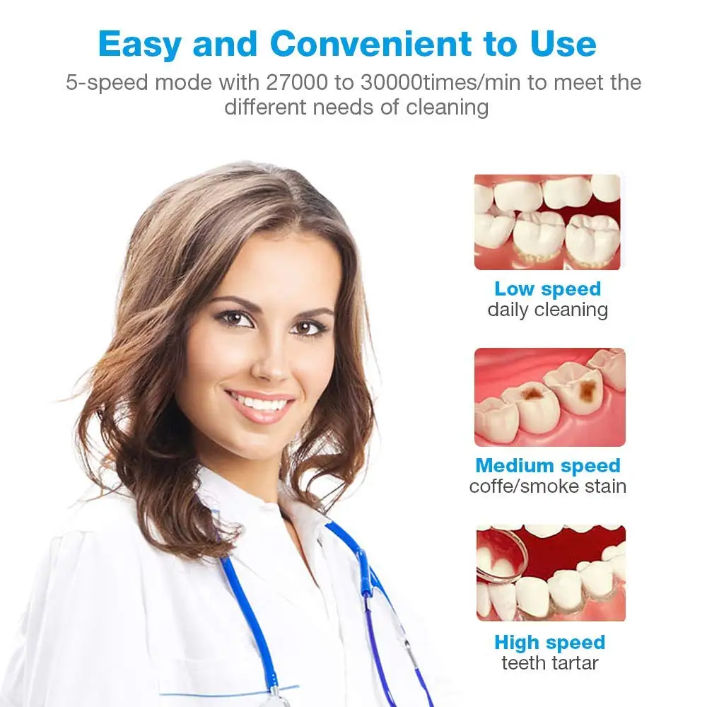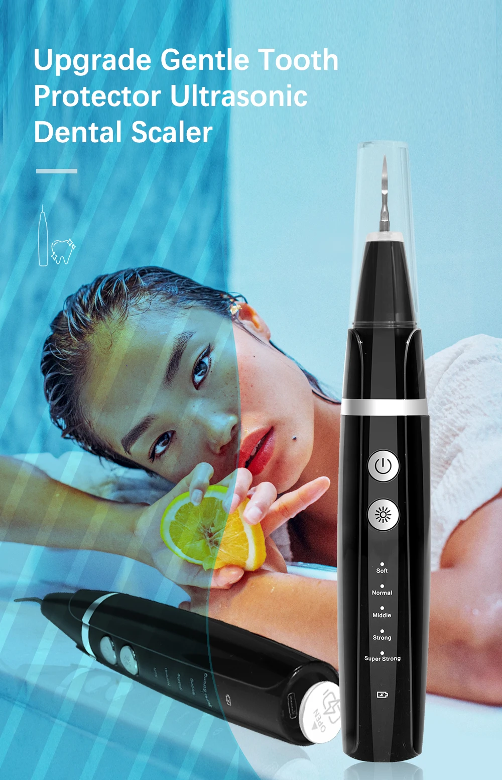 2)5 классов регулируемой частоты для удаления упрямого камня, зубного камня и пятен зубов. Автоматическое отключение после полной зарядки, автоматическая защита и энергосбережение.