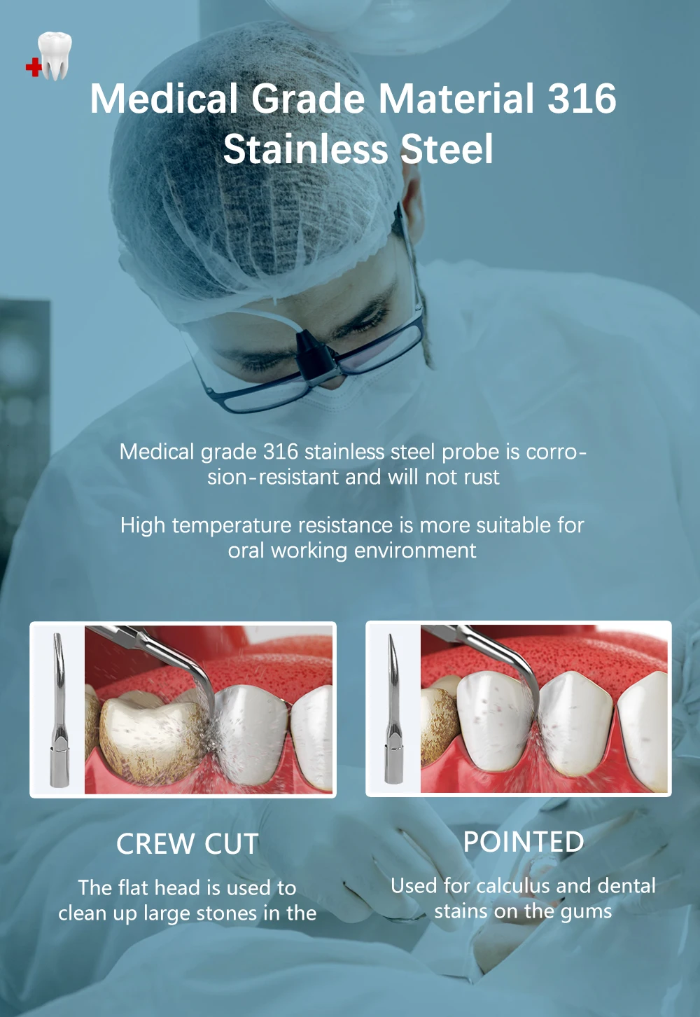 1) ультразвуковая технология, частота высокой интенсивности 12000 раз в минуту, эффективно разбивает упорное вычисление, уменьшает повреждения эмали и резинки, которые могут быть вызваны ручными стоматологическими инструментами.