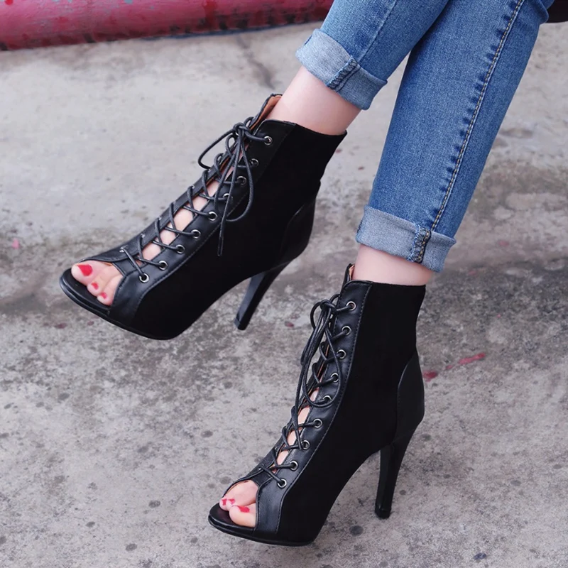 Модные женские ботильоны-гладиаторы на высоком каблуке; Осенние туфли-лодочки на шнуровке с открытым носком; Женские ботинки из искусственной замши наивысшего качества