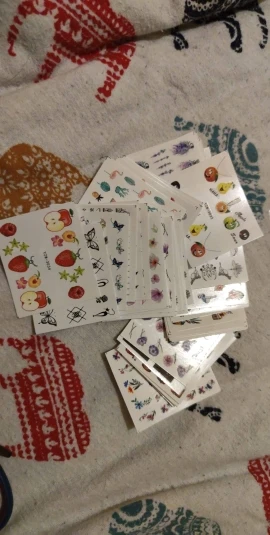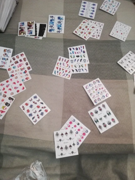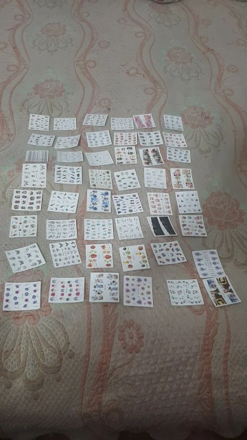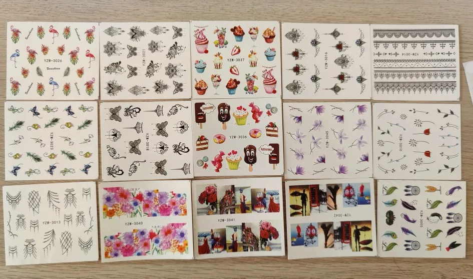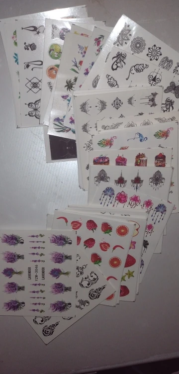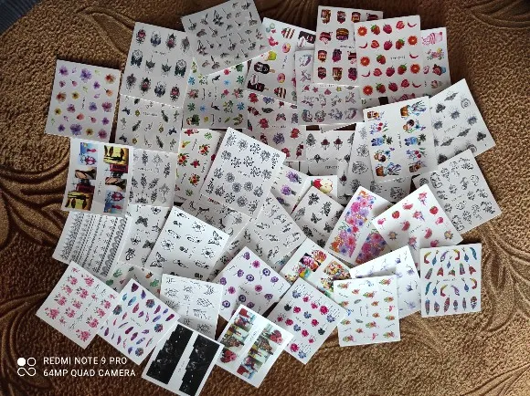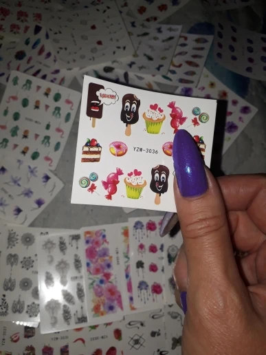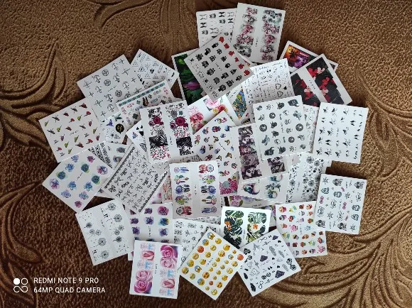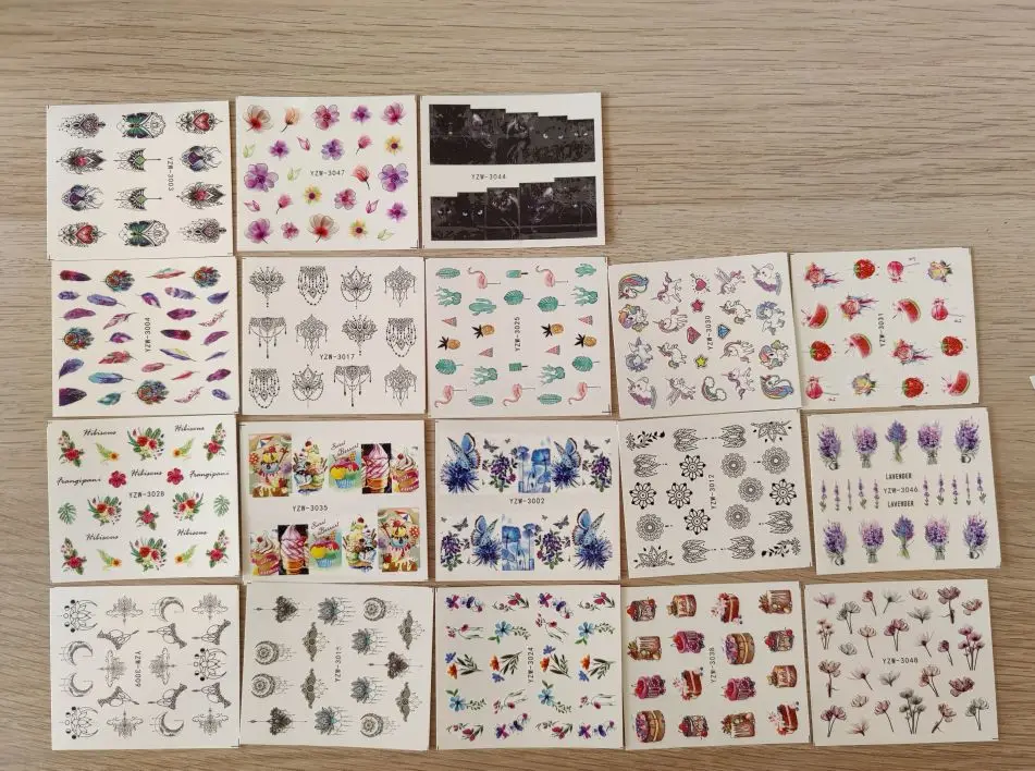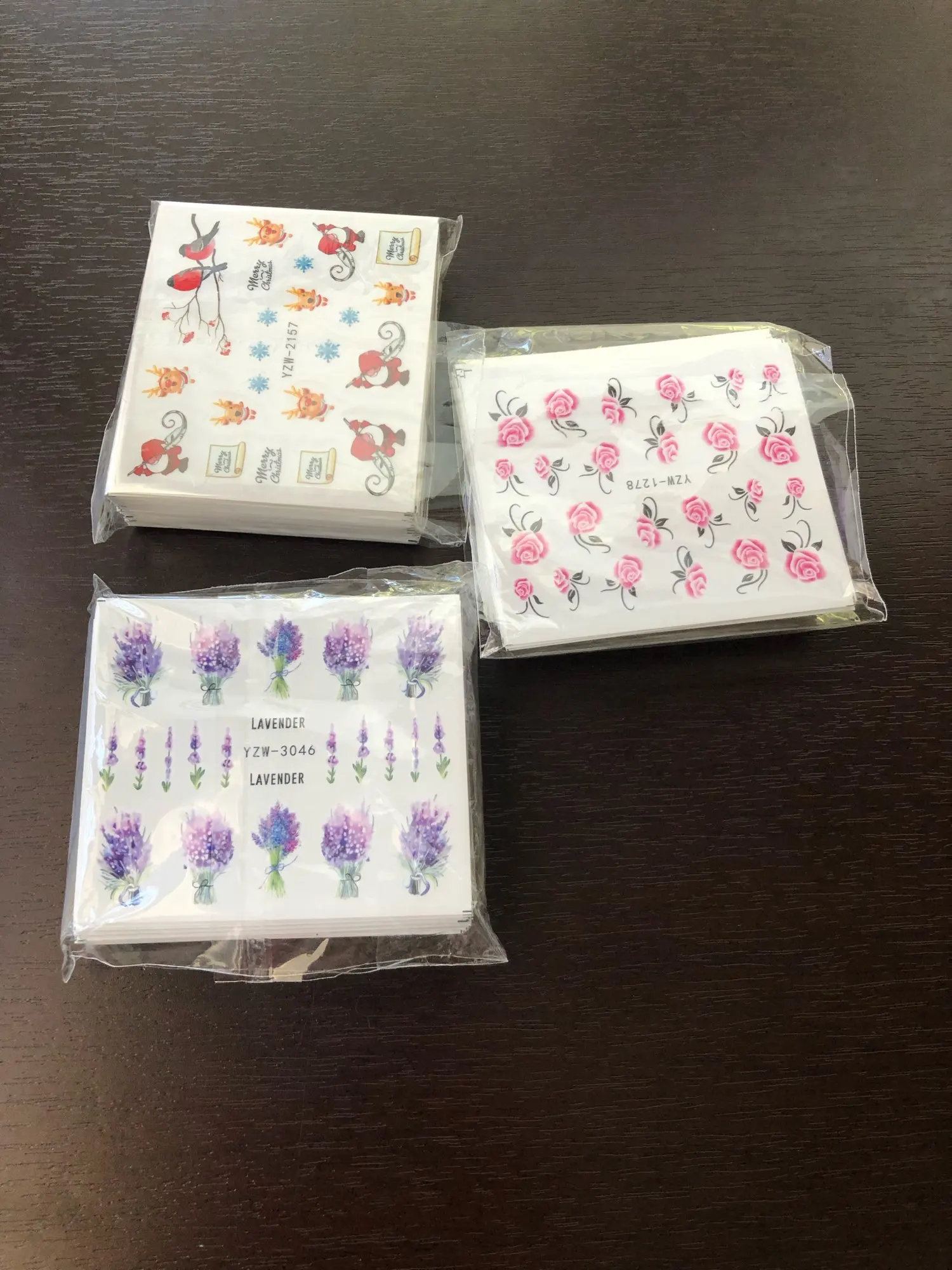 Наклейки разных тематик, цветочки, птички, детские, тортики, черно -белые, на весь ноготь и т.д. Выгоднее покупать набором, чем по-отдельности. Наклейки все те же самые и по качеству такие же, как и при покупке по- отдельности.