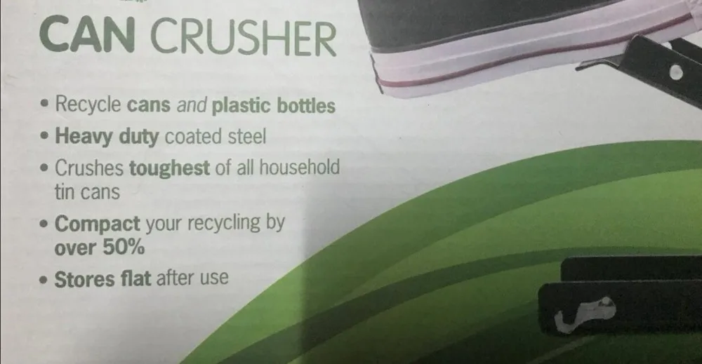 Не бросать его .... раздавить его с этой эко-баночной дробилкой от Eddingtons. Идеально подходит для переработки банок и пластиковых бутылок. Сверхпрочная конструкция измельчает самые жесткие из всех бытовых жестяных банок. Компактная переработка более чем на 50%. Изготовлен из стали с покрытием. Хранится сразу после использования. Размеры 12 см в ширину, 37,5 см в длину, 4,5 см в высоту (в плоском положении). Коробка