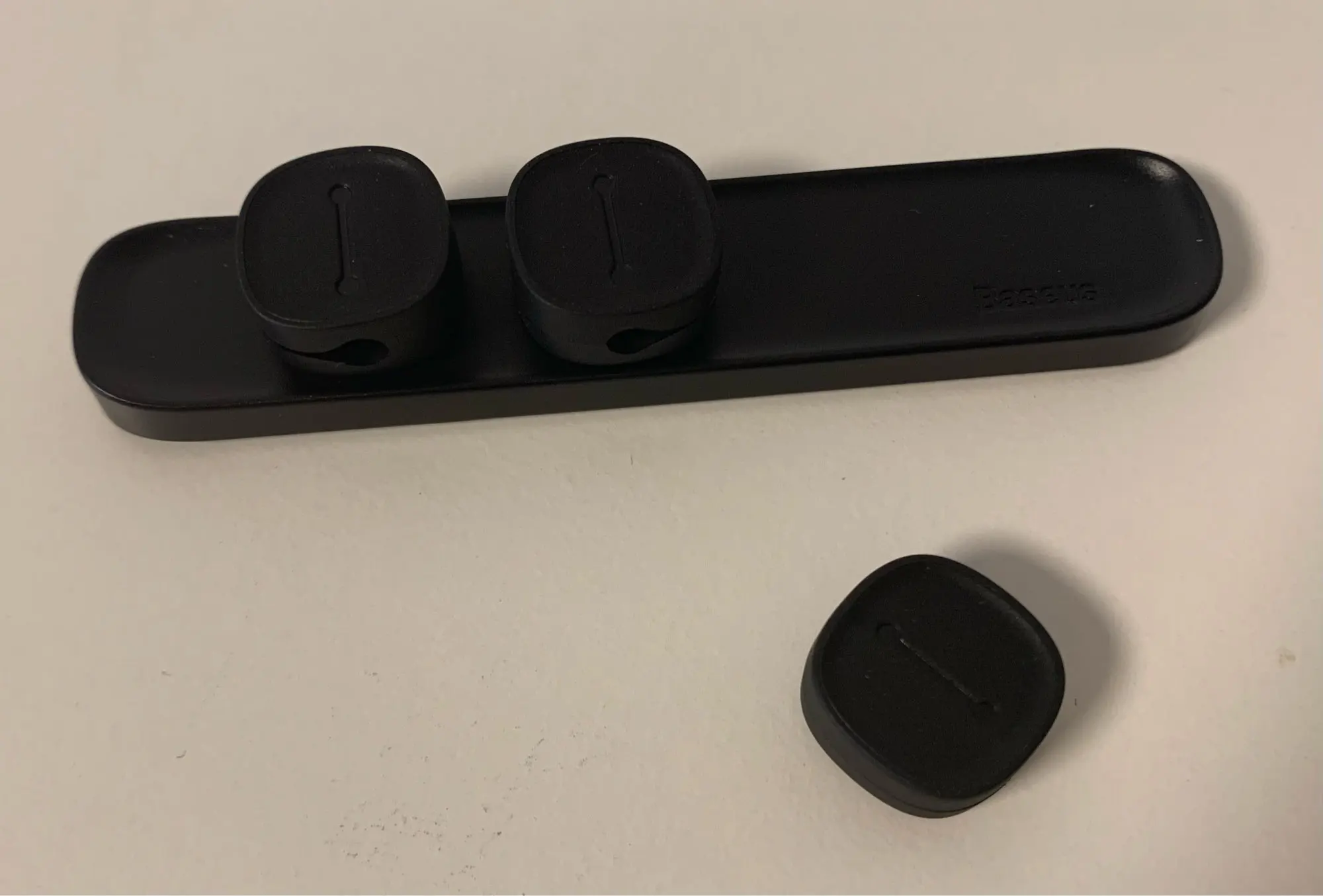 Хороший крепеж, узенький, мне нужен был узкий, обычно все пошире, аккуратный. Для достаточно тонких кабелей, мои телефонные я всунула, но с трудом, ну они просто крепче держатся и всё, это не проблема. Держатели (квадратные) держатся только на магните, свободно снимаются с базы, переставляются. Нужно быть аккуратнее, можно сбить такой держатель с базы неаккуратно, магнит не особо сильный, но с кабелем на базе держится нормально, если не задевать ничего не упадет. В целом система удобнее чем статичный такой крепеж (для меня удобнее), из статичного кабель нужно вынимать или вытягивать его подлиннее, чтобы подключить телефон, а тут закрепил кабели и когда нужно снимаешь вместе с держалкой с базы и подключаешь в телефон, потом назад на базу ставишь.