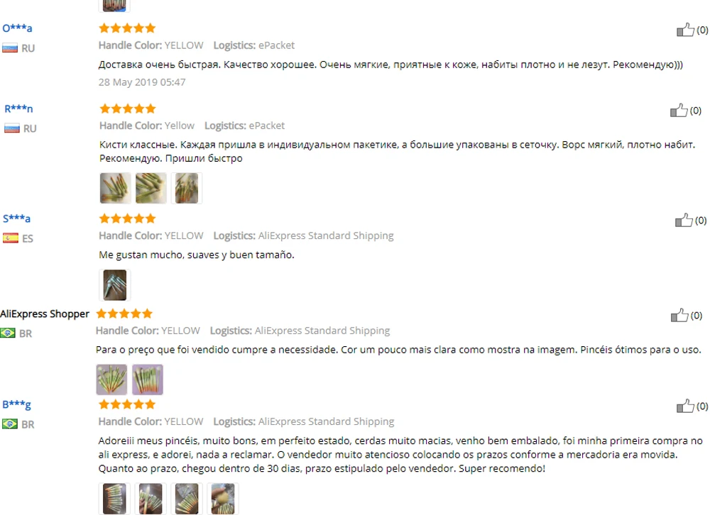 ставлю 5 звезд, потому что кисти очень мягкие, ворс не выпадает,цвет как на картинке, все было хорошо запоковано. одна кисточка примерно 16см. До Беларуси, Гродненской обл. пришло за месяц где-то. Заказ отправили на следующий день. С продавцом не общалась((