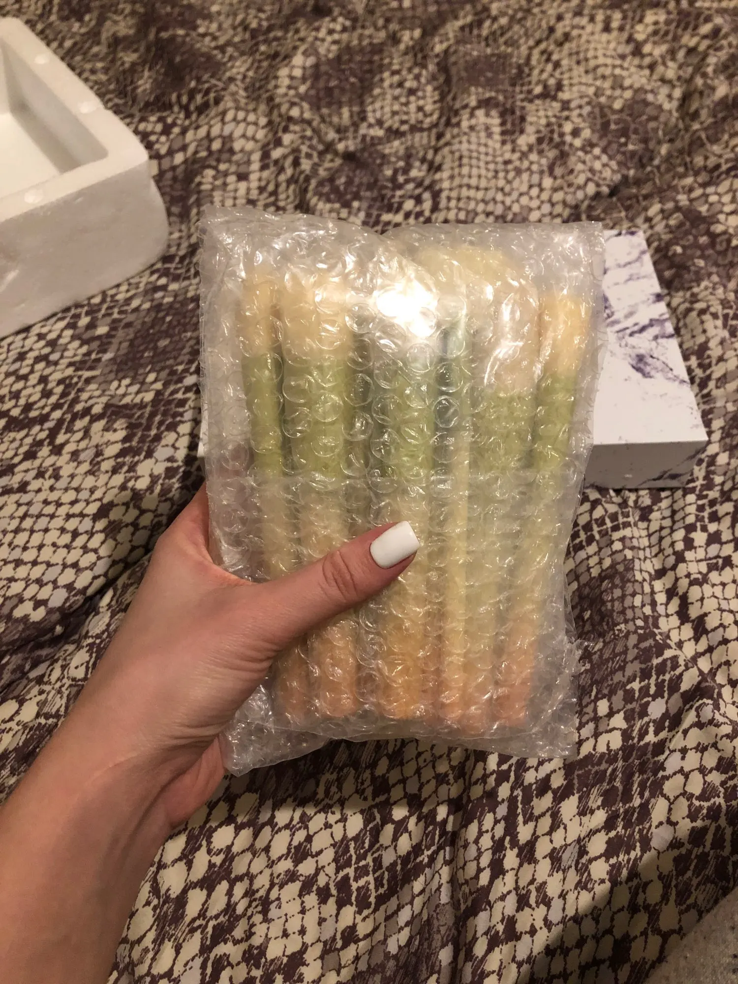 пришло за 12 дней. удобные, хороший центр тяжести, рука не устаёт держать большие кисти. безумно мягкие и приятные к лицу, не сыпятся, не лезут, ворс ровный, без торчащих ворсинок. такие же яркие как на фото. тушуют тени прекрасно. единственное кисть для хайлайтера замялась, но после помывки расправилась