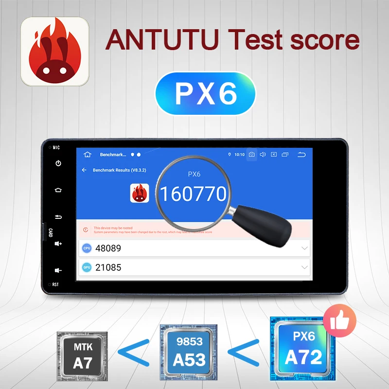 PX6-лучший чип на всем рынке в настоящее время, он работает быстрее всех типов. ANTUTU оценка 160770, это лучше, чем 7853 4G + 64G, это лучше, чем PX5, это лучше, чем все остальные 4 + 64G типа на всем рынке. Радио PX6 может загружать больше видов приложений для android с рынка android, а Приложение может работать лучше, чем другие радиотипы.