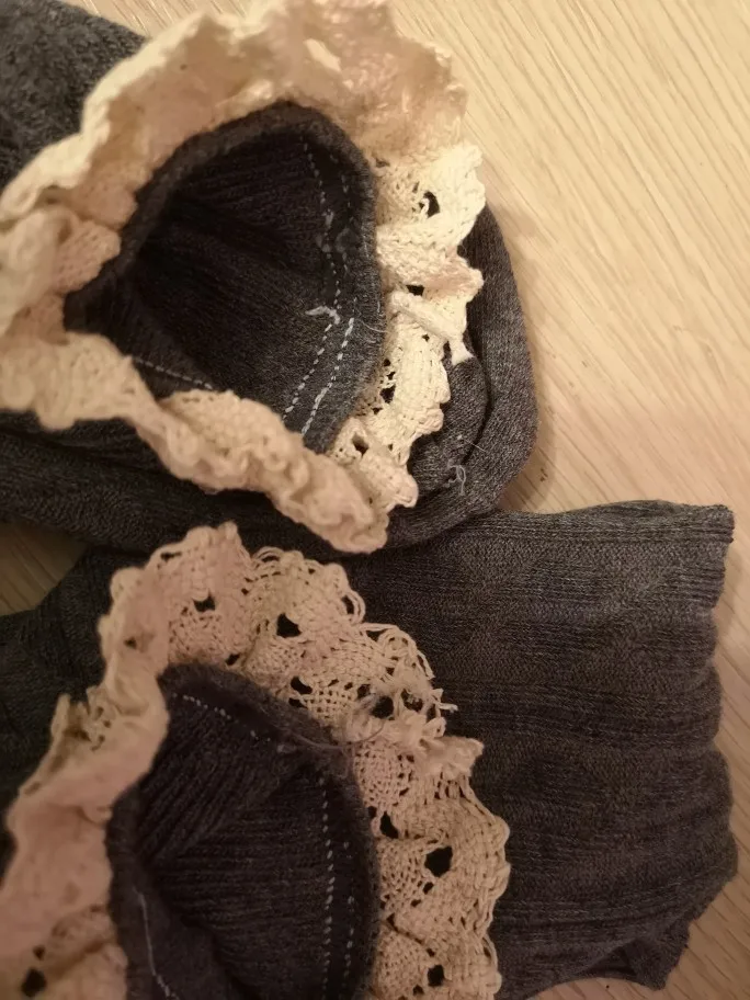 Резинка с кружевом очень узкая, кружево не иянется, поэтому носить как чулки невозможно, а оставляя ниде, пооучается все сморщено. Резинка у кружева на одном чулке порвана. И цвет обычный серый, а не как на картинке серо-коричневый.