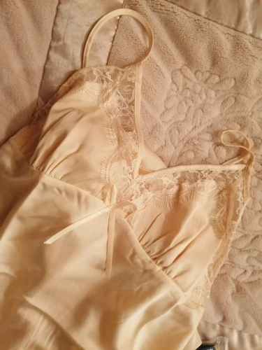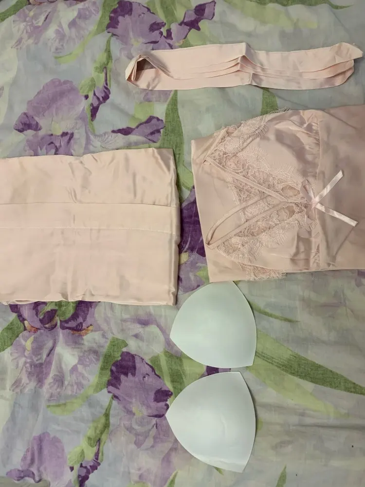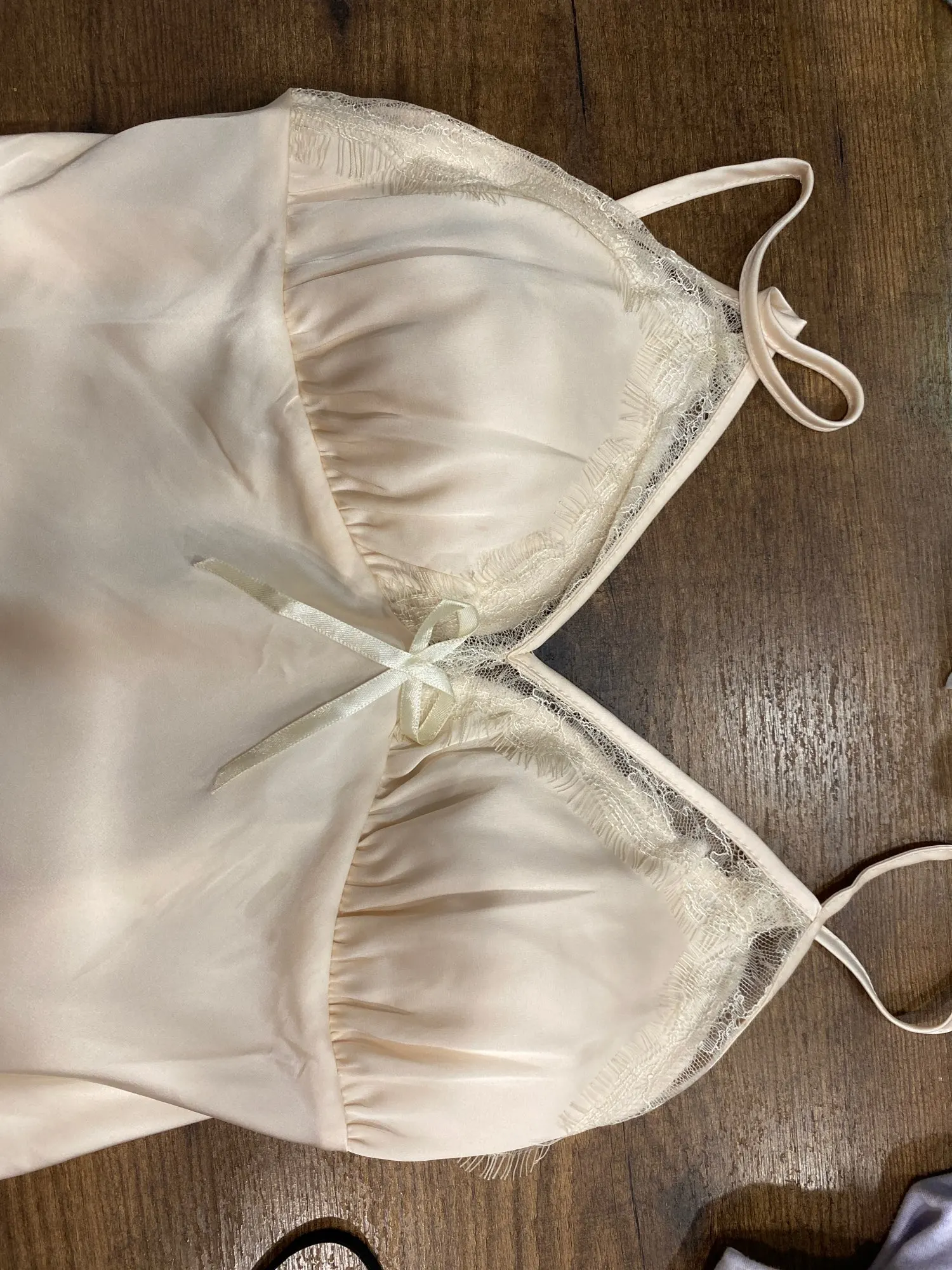 Пеньюар восхищает! Цвет шампанского очень красив, как на фото. Вкладыши белого цвета, при носке или во сне их не ощущаю, Грудь выглядит лучше, но лишь визуально. На поддержку не рассчитывайте. На спинке резиночка хорошо смотрится. И почему ее все не делают? Очень удобна. Швы, строчки Ткань нежнейшая. Размер М подошёл на 42-44, ОГ 88 ОПГ 76