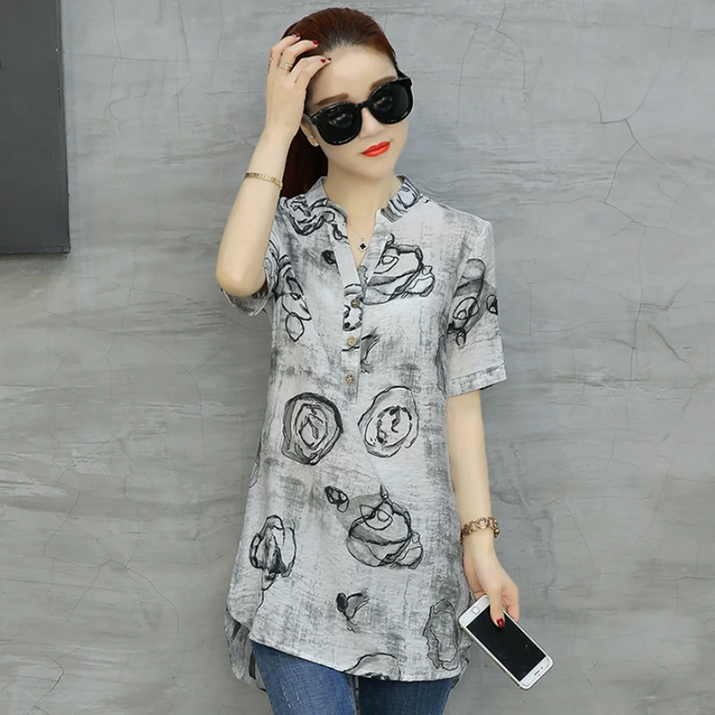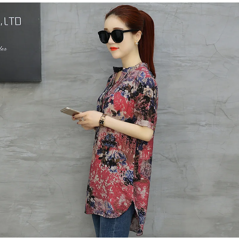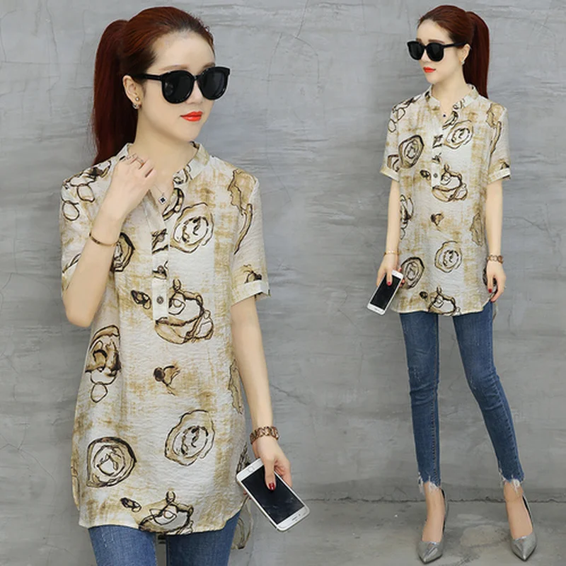 Модные женские блузки 2021, длинные летние топы с коротким рукавом, шифоновая блузка с цветочным принтом, рубашка, Женские топы и блузки, блузы D532 40