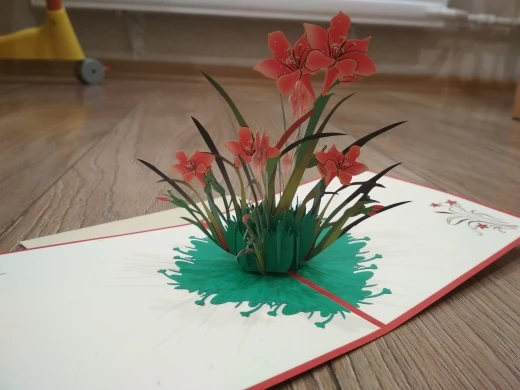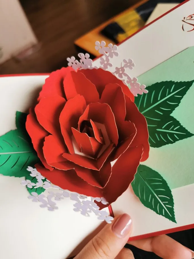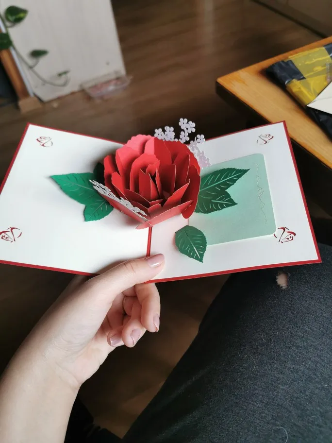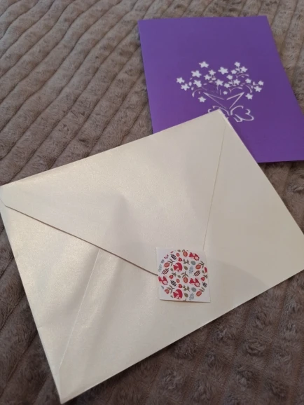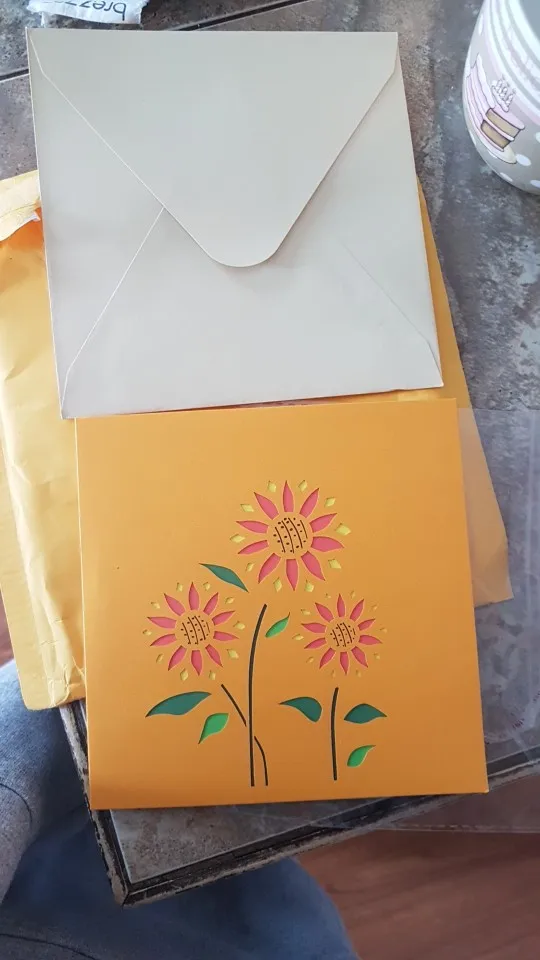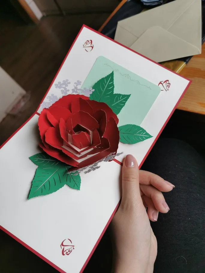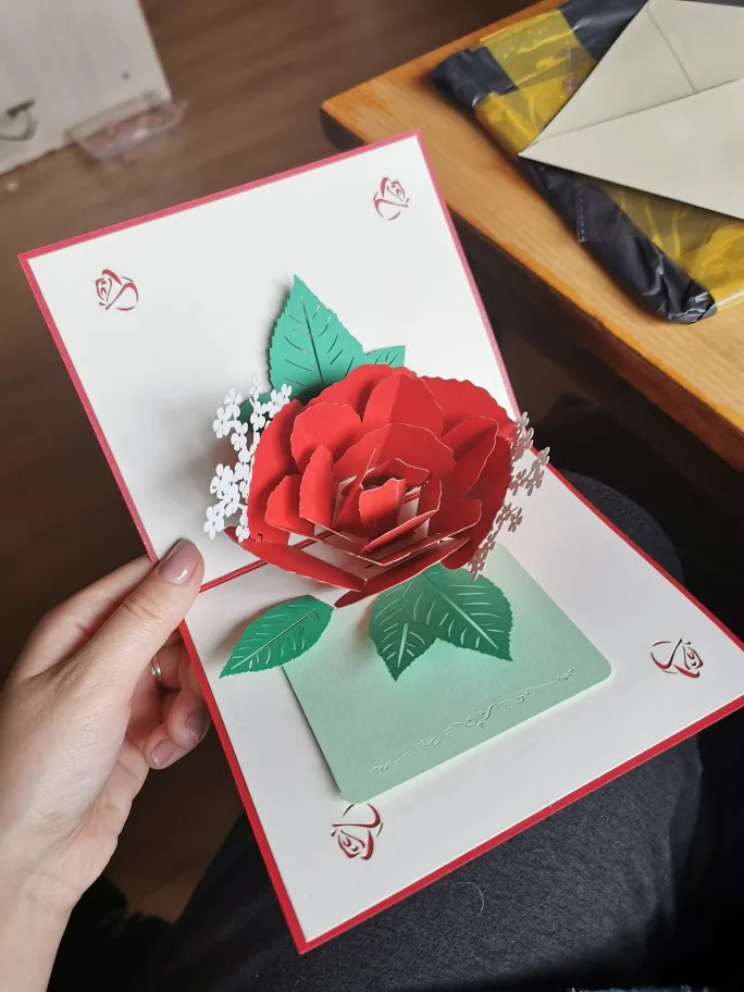 Посылка ехала около месяца, при этом АлиЭкспресс объединил два разных заказа из разных магазинов. Открытки были упакованы в бумажный конверт с пупырышками внутри. В комплекте с открыткой идут наклейка для запечатывания, бумажный конверт и прозрачный. Всё соответствует описанию, открытка очень красивая, детали отлично вырезаны, смотрится шикарно. Внешние части довольно плотные, не помялись, центральная часть из более тонкой бумаги. Букет объемный, издалека выглядит как настоящий. Похоже на настоящую магию. :) Думаю, любой человек, которому подарят такую открытку, будет счастлив.