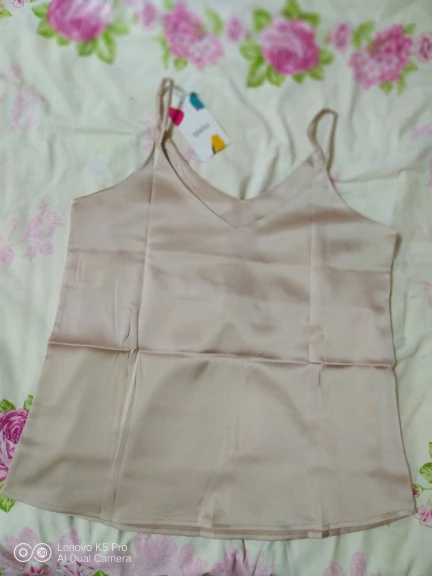 Из-за распродаж доставка дольше, чем обычно бывает, до Ростовской области - 27 дней. Покупала за 376. На свои параметры 80-60-90 (xs/s) зачем-то заказала m, видимо что б было оверсайз, как на модели. На мне собственно так и сидит. Топ будет хорошо смотреться с пиджаком или кожаной курткой. Ткань приятная, гладкая. Мне прям нравится ощущение гладкости. Но! На ткани капли воды превращаются в ужасные пятна. После глажки, сразу пришлось стирать топ. Плюс к тому же он сильно мнётся и электризуется. Бирок с составом как всегда нет. Цвет не соответствует заявленному. Я хотела золотой как на фото, но в реальности он другой. В принципе и этот красивый цвет, к тому же выглядит дорого, но факт остаётся фактом. В целом топ выглядит хорошо. Но у него куча минусов. Дикого восторга я не испытываю.