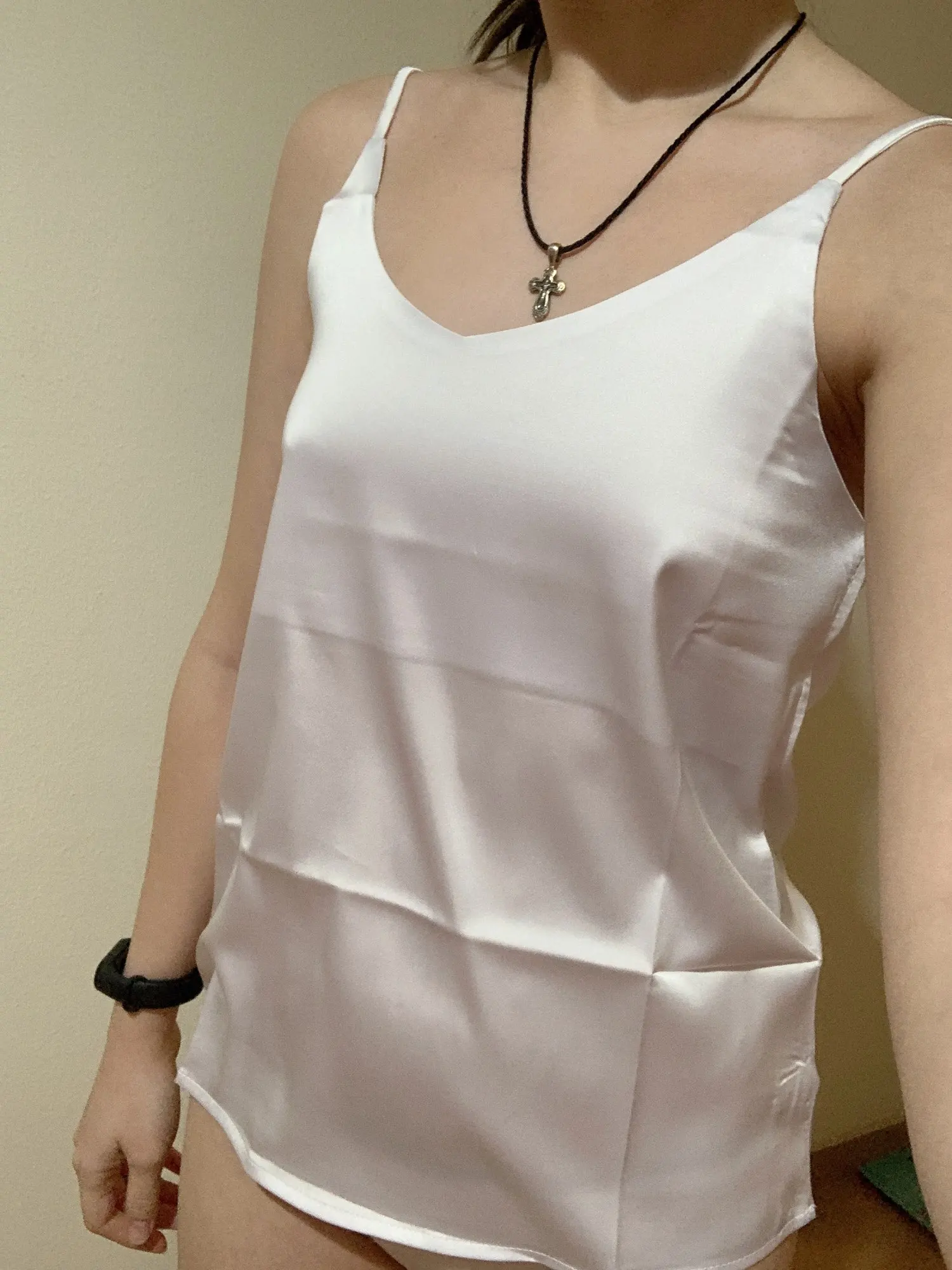 Доставка в Самару заняла 2 недели. Трек-номер отслеживался. Стоимость заказа ₽494,16. На свои параметры ОГ 97см, ОТ 73см, ОБ 95см взяла размер XL - можно даже было взять L (слишком свободно сидит). Лямки не регулируются, поэтому придётся перешивать, иначе грудь будет видно (слишком низко сидит). Цвет белоснежный. Размеры: по линии груди 46см, по линии талии 45см, по линии бёдер 50см. В этот раз после стирки пятен никаких нет, отлично гладится, правда, и мнётся тоже быстро.