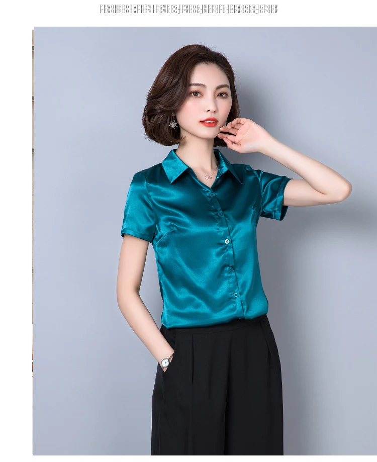 Однотонная модная деловая офисная атласная блузка, женские элегантные летние топы с коротким рукавом, женские тонкие облегающие рубашки в Корейском стиле для дам
