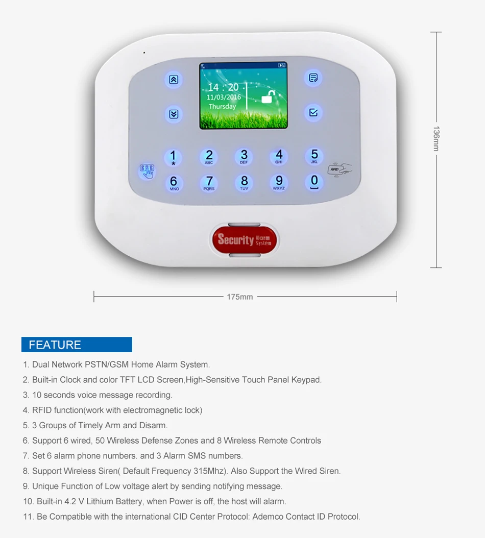 • Совместимость с международным протоколом CID center: протокол Ademco Contact ID