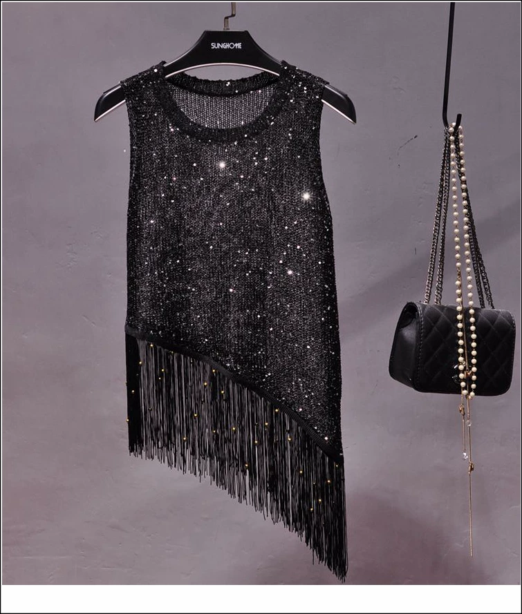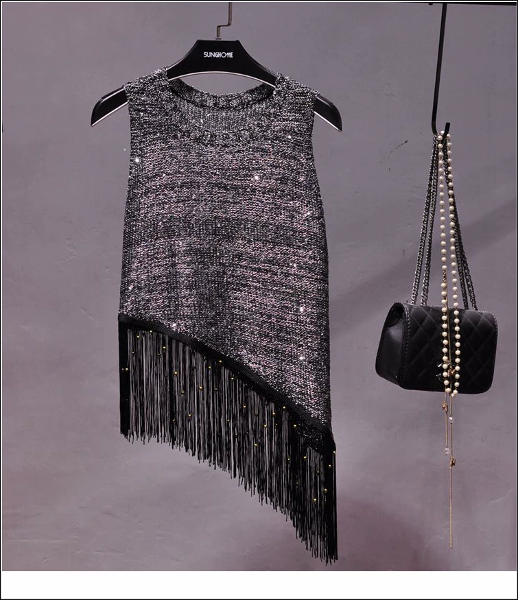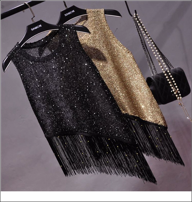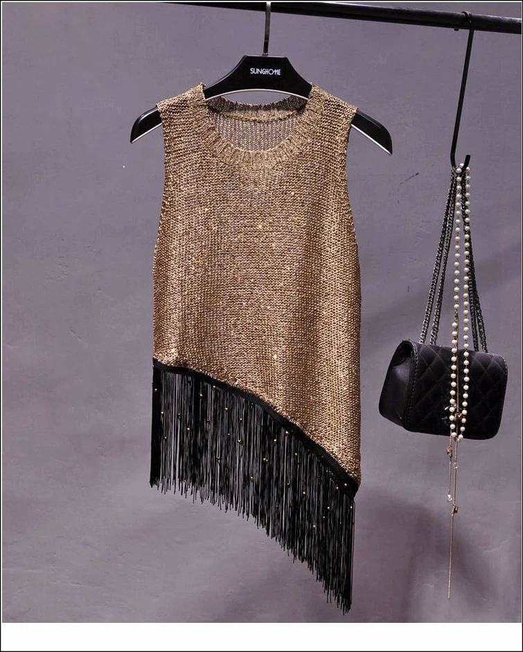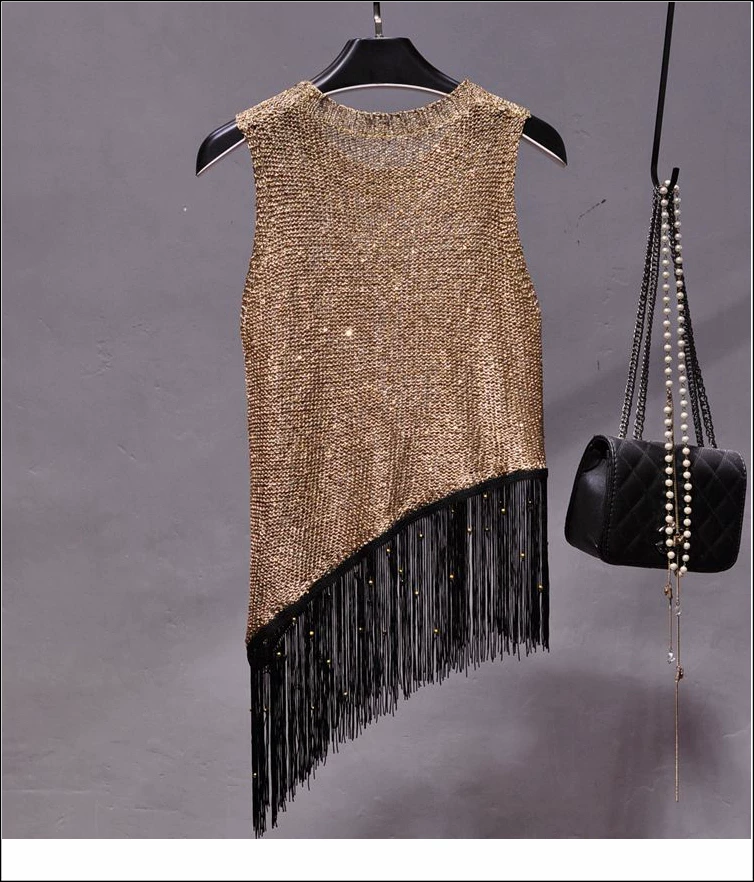 2020 безрукавка с круглым вырезом, необычная вязаная женские майки, топы с блестками, блестящие золотые майки, женская модная блестящая майка с кисточками