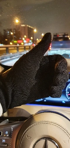 Хорошие перчатки, на окружность ладони 18см и длину среднего пальца 8,5 см, размер М подошёл хорошо. Ткань синтетика, но выглядит достойно. На указательных пальцах есть прошивки для сенсорного экрана. На телефоне я ими печатать не могу, но свайпать вполне хорошо получается.