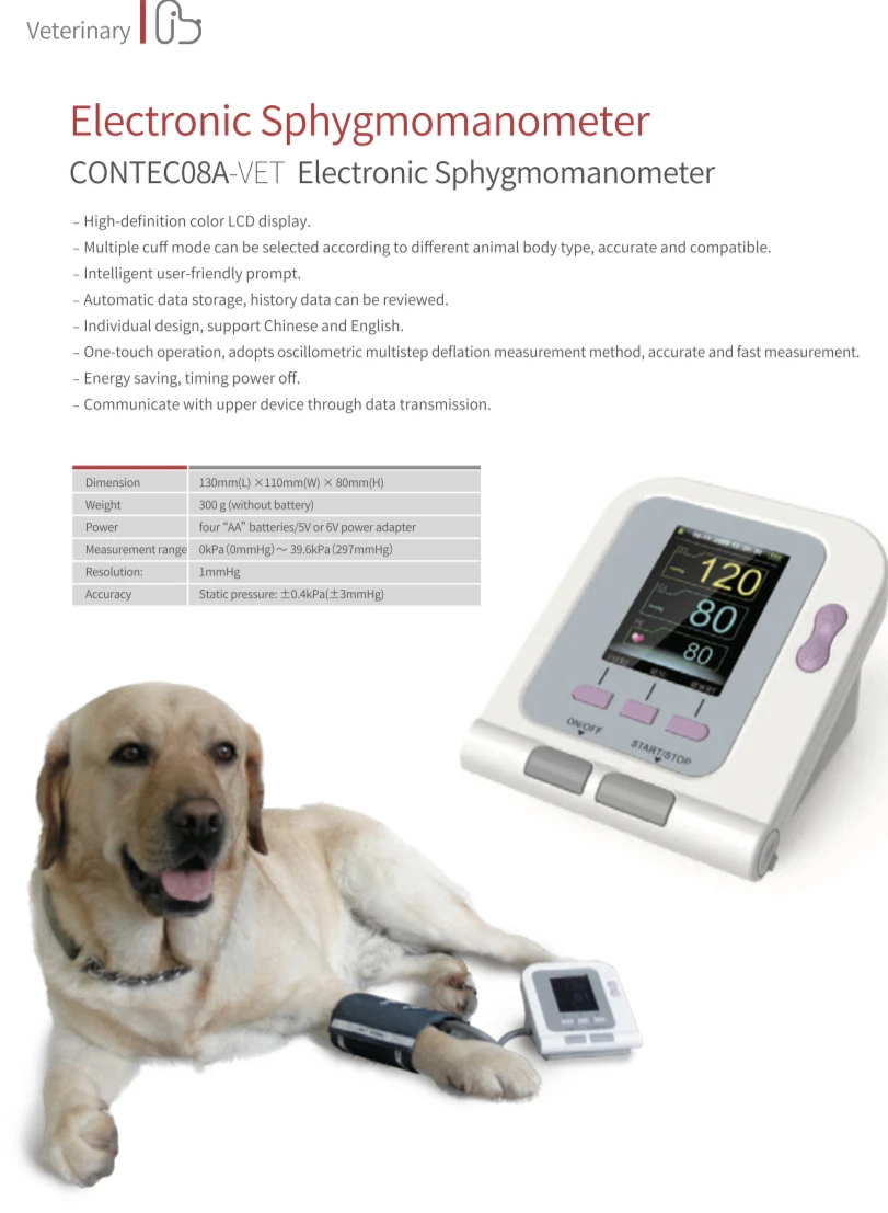 CONTEC08A-VET-электронный сфигмоманометр, который может измерять кровяное давление у животных. Устройство оснащено полностью автоматическим измерением, цветным ЖК-дисплеем высокой четкости, английским/китайским интерфейсом и высокой видимостью. Он имеет интегрированное измерение параметров, отображение и запись вывода в одном устройстве, и он использует интерфейс обзора данных, такой как «Список данных», «трендовая диаграмма», «Большой шрифт» с легким и простым управлением. Может применяться для рутинного тестирования семейных домашних животных, больниц для животных, клиник, ферм и т. д.