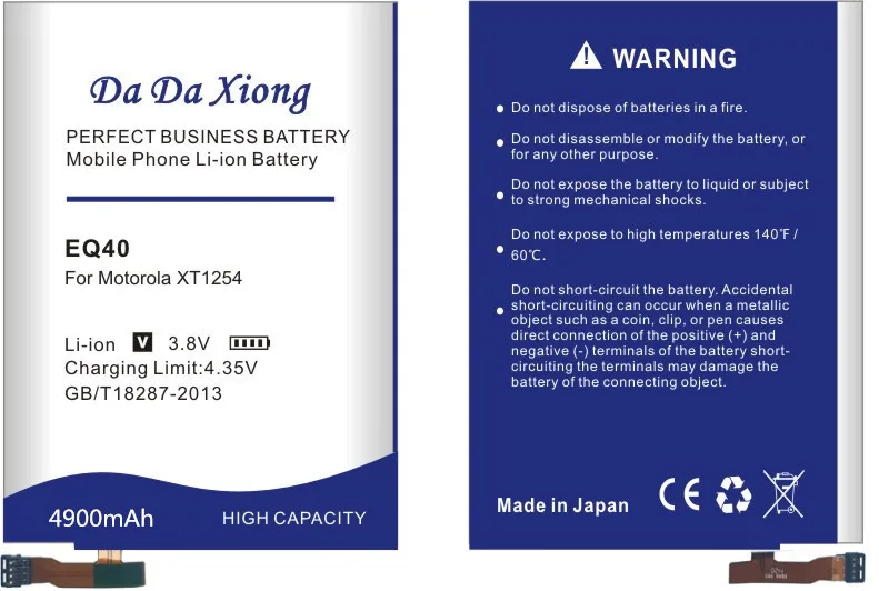 100% оригинальный новый и высококачественный аккумулятор Da Xiong. Емкость:4900mAh Напряжение: 3,8 в Тип: литий-ионный Совместимость: дляMotorola Moto Droid Turbo XT1225 XT1254 Безопасность и окружающая среда: функции двойной защиты. Двойная электрическая плата IC и PCB защищает от разряда заряда и короткого замыкания. Наша батарея такого же размера, как и оригинальная. Двухлетняя гарантияПосылка входит: