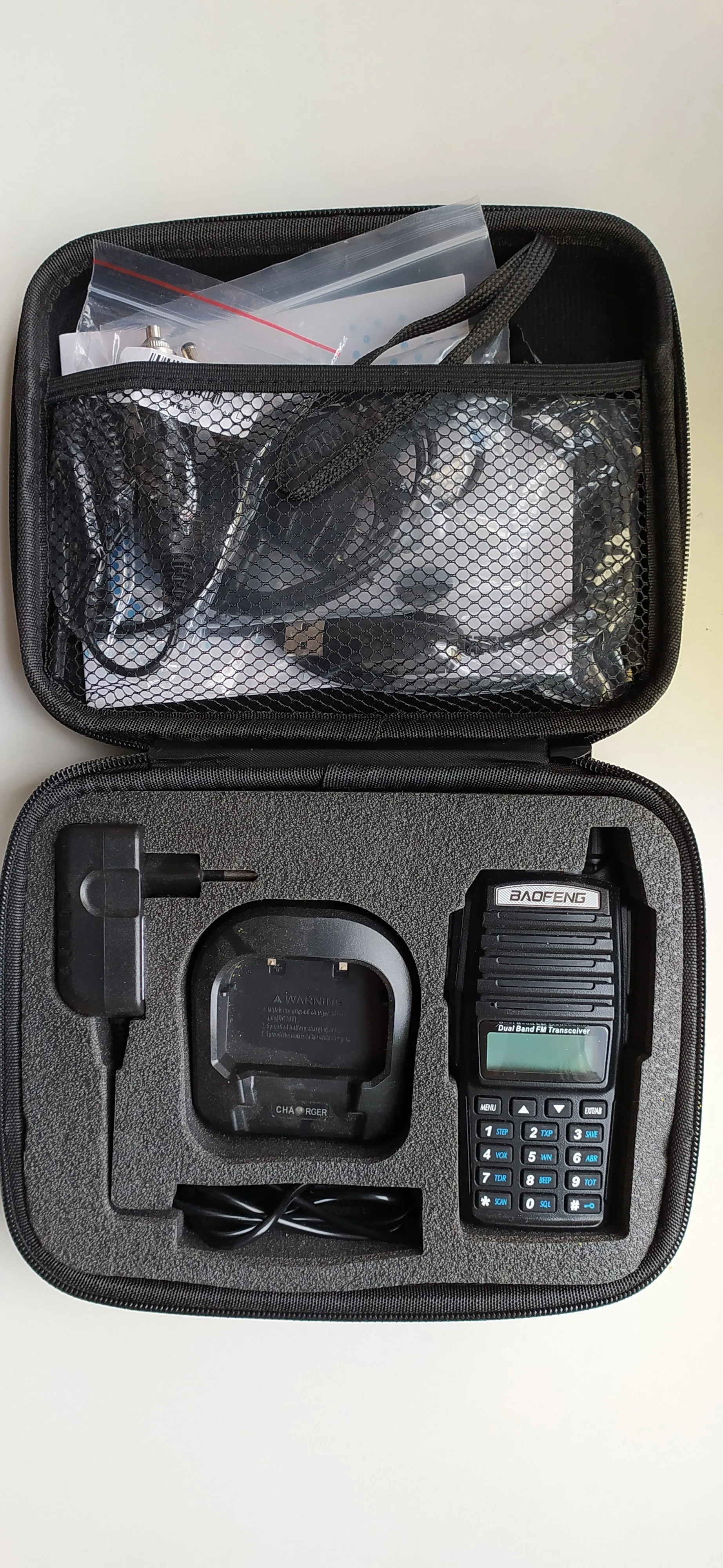 В сумку вошла не только рация, но и гарнитура, провод для перепрошивки, штатная антенна и удлиненная антенна, штекер прикуривателя для зарядки, клипса на ремень, темляк, руководство пользователя и диск с драйверами. Бездонная сумка. Единственное не стал впихивать автомобильную антенну. Очень компактная и вместительная сумочка.