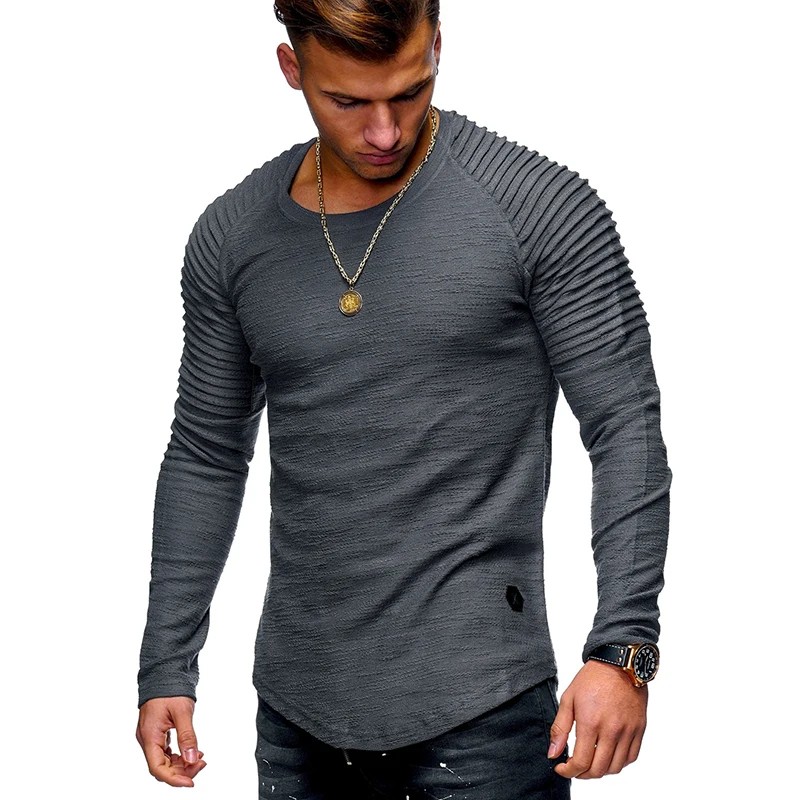 Однотонная плиссированная футболка с длинным рукавом, Мужская Весен...