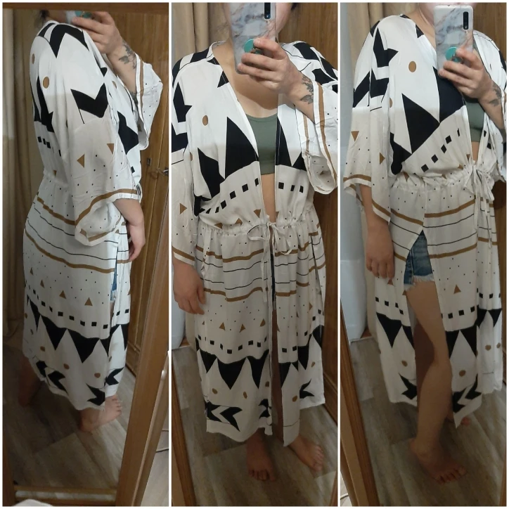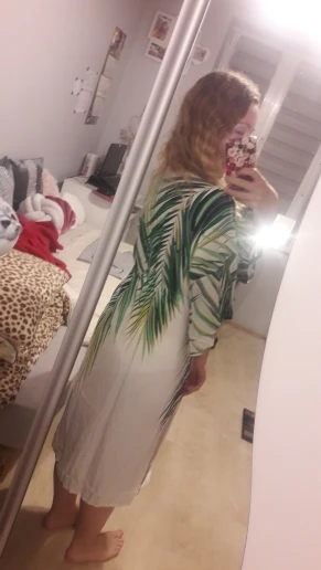 Оплатила 22.09 получила 05.10 Покупала за 841,55р (с купоном). Доставка AliExpress Standard Shipping, трек код отслеживался. При открытии ничем не пах. Ткань натуральная, в жаркую погоду на море будет комфортно. Расцветка соответсвует фото в описании. Швы ровные и аккуратные. На мой рост 156см по длине до щиколоток. Хотела зашить по бокам разрезы, но если выравнивать по рисунку, край не сходится. Пока оставила так