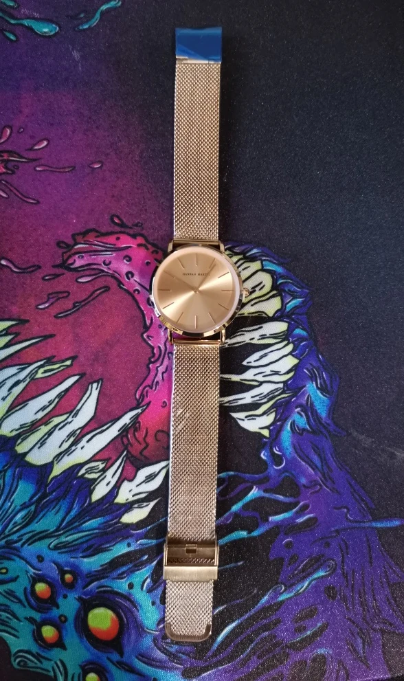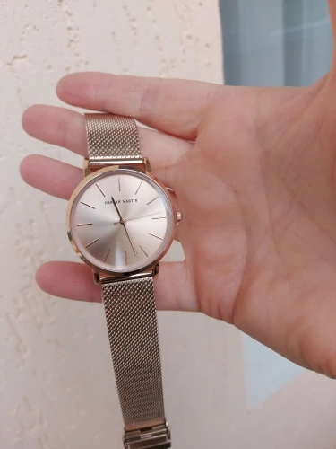 Красивые часы, выглядят качественно. Посылку домой принес курьер, быстрая доставка. Часы были аккуратно упакованы в кучу пакетиков и коробку, все поверхности и ремешки заклеены защитной пленкой. Я выбрала цвет "розовое золото" , переживала, что сильно красный оттенок будет, но нет, цвет в реальности как золото 585 пробы. Выглядит достойно. Ремешок и крепеж сделан очень аккуратно. Только цепь ремешка немного щиплет волоски на руке, но не сильно, приемлимо. Часы довольно тяжёлые.