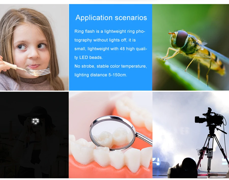 Основными особенностями макросветодиодной кольцевой вспышки являются функции левой вспышки и правой вспышки, которые делают объект более стереоскопичным и используется для макро, научные исследования, медицинское лечение и личная фотография для хобби.
