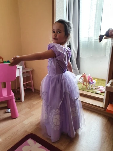 Моя дочь будет 8 лет, и размер 9 подходит ей отлично, очень хорошая ткань хорошего качества, я очень доволен платьем.