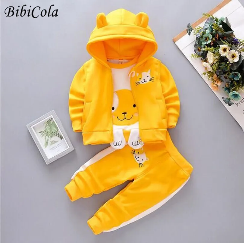BibiColaМодная одежда для маленьких девочек зимний теплый костюм с рисунком медведя, толстовка с капюшоном, комплект одежды для малышей, хлопковые спортивные костюмы, 3 предмета